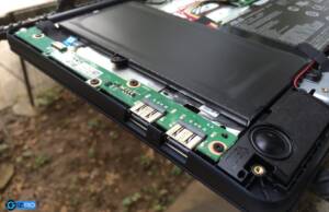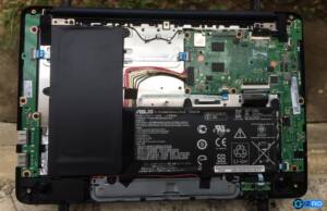 Carcasa spate poate fi îndepărtată uşor, întrucât este fixată în şuruburi, dar îţi putem spune din start că nu ai posibilitatea de a face upgrade la componentele interne, întrucât toate sunt practic integrate în placa de bază. Prin urmare, nu poţi să pui mai multă memorie RAM sau să adaugi spaţiu de stocare, aşadar nu prea ai de ce să doreşti să desfaci capacul spate.
