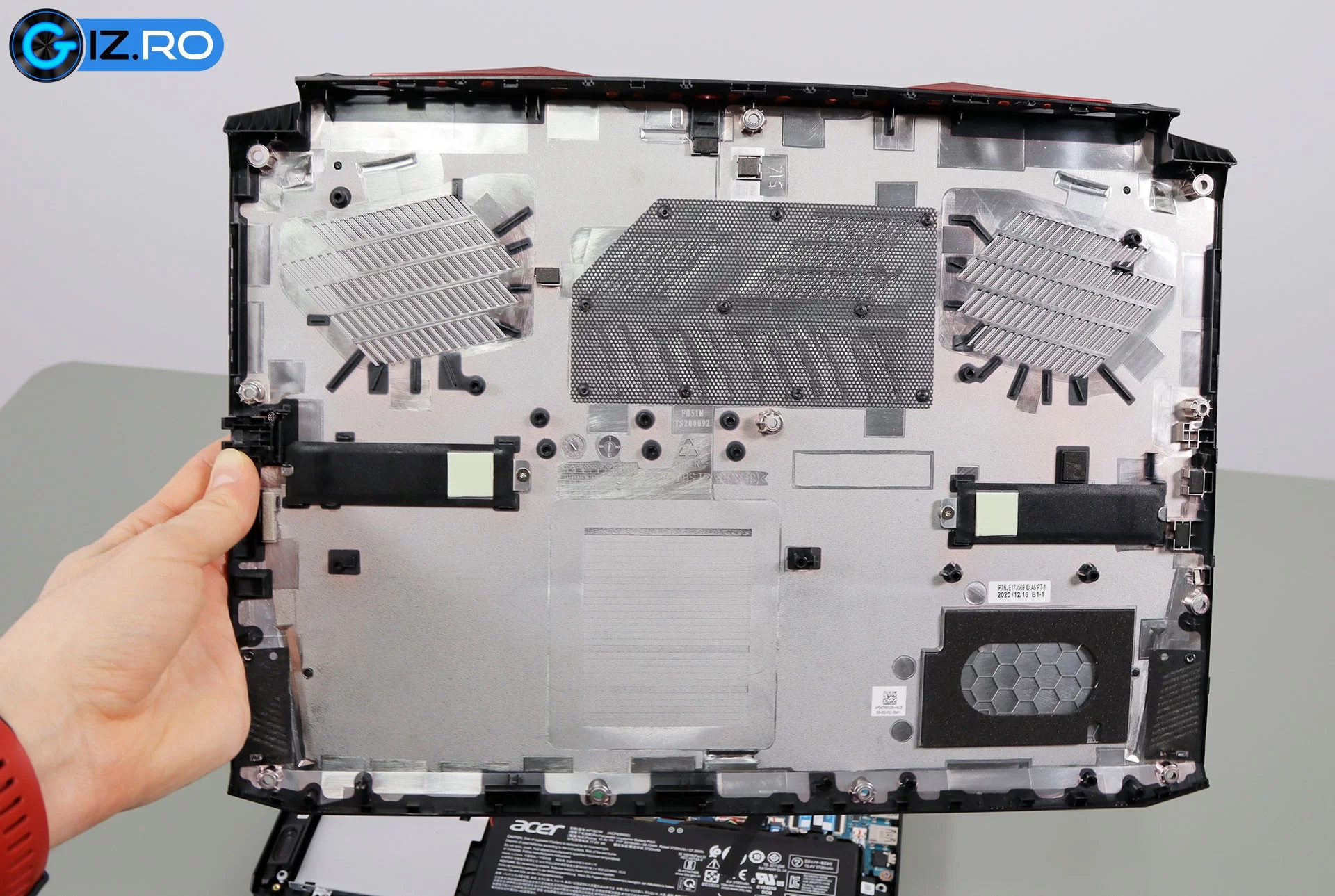 Accesul la componentele interne este simplu și necesită doar înlăturarea șuruburilor care fixează capacul inferior, însă trebuie să fiți atenți la dimensiunea lor pentru că nu toate sunt la fel. Utilizatorul va avea acum acces direct la memorie, unitatea sau unitățile de stocare, baterie, sistem de răcire și sistem audio.