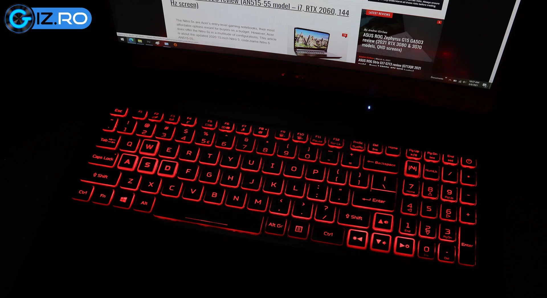 Tastatura de pe Nitro 5 este disponibilă în continuare în două versiuni, cu iluminare roșie pentru modelele mai ieftine și cu iluminare RGB cu patru zone pentru configurațiile superioare. Noi am testat cea de-a doua variantă.