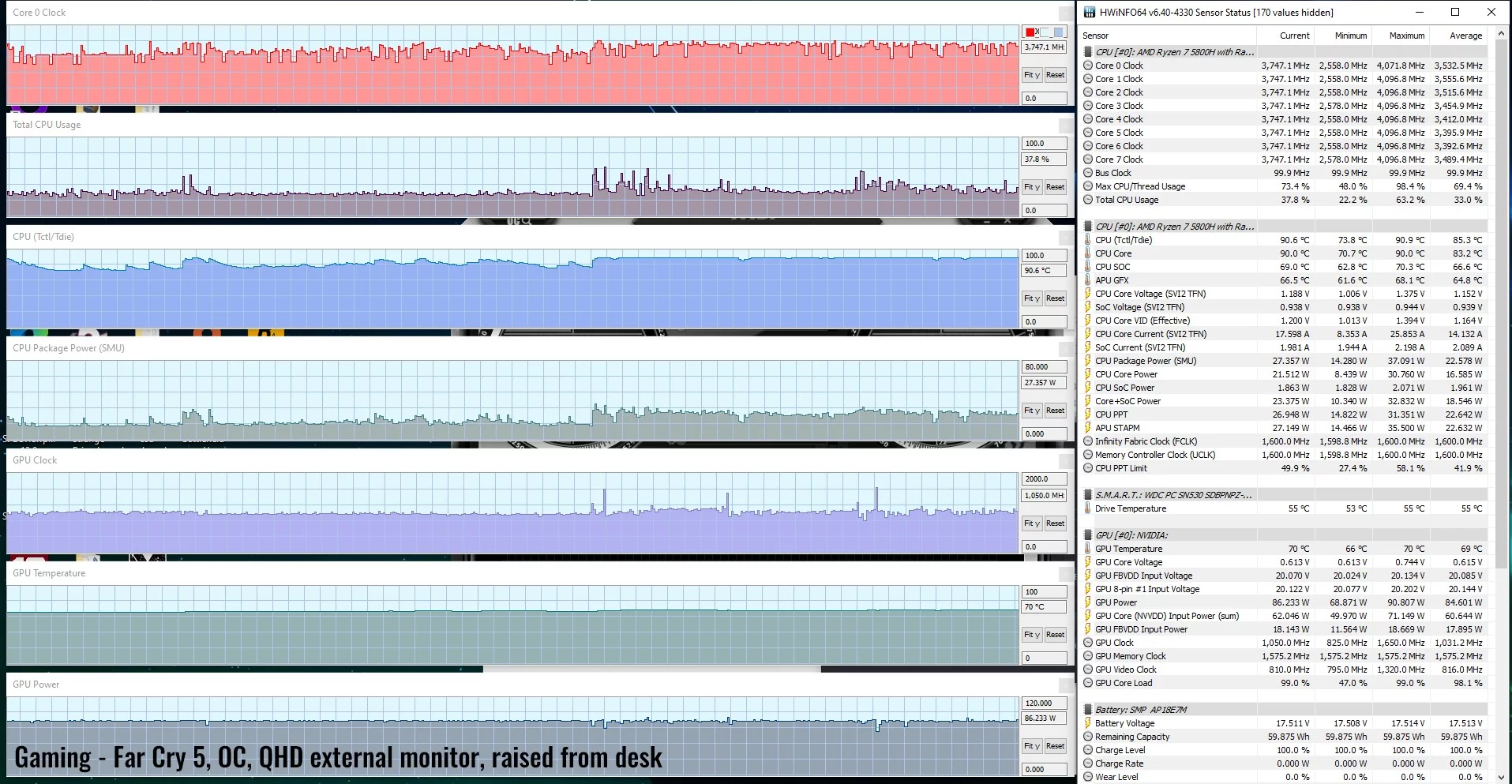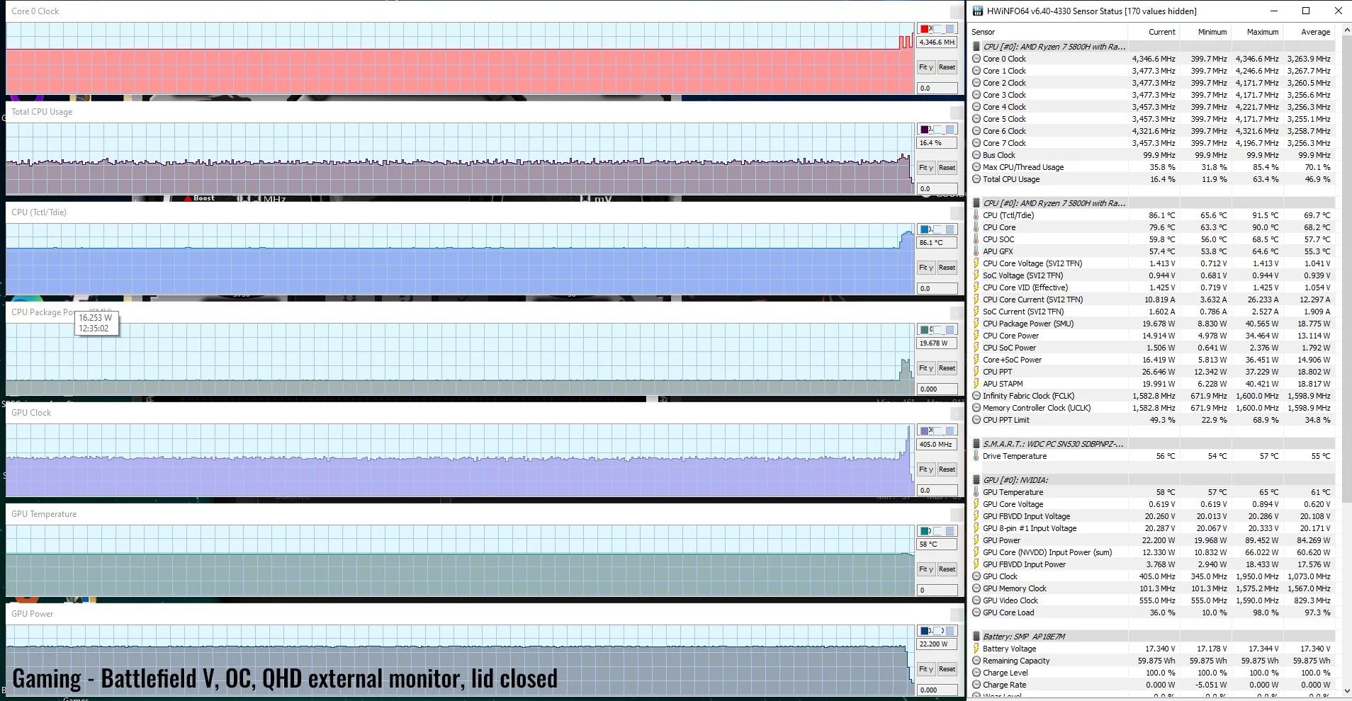 Pentru cei interesați să se joace pe un ecran extern, mai jos se vede și comportamentul cu capacul închis și laptopul pus pe un stand, temperaturile fiind acum mai bune pentru că și sistemul de răcire este mai bine alimentat cu aer.