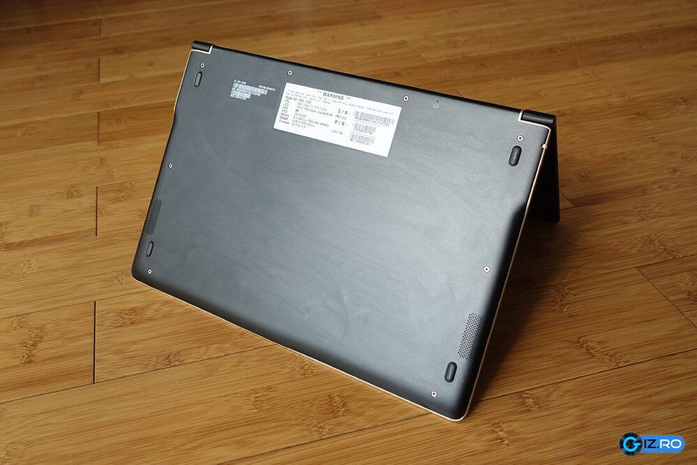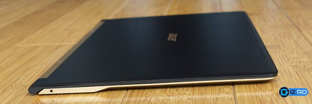 Laptopul este disponibil într-o singură versiune de culoare, cu un exterior negru mat, o nuanţă elegantă, dar care atrage cu uşurinţă amprente, și un interior auriu, o alegere cam bombastică din punctul nostru de vedere.