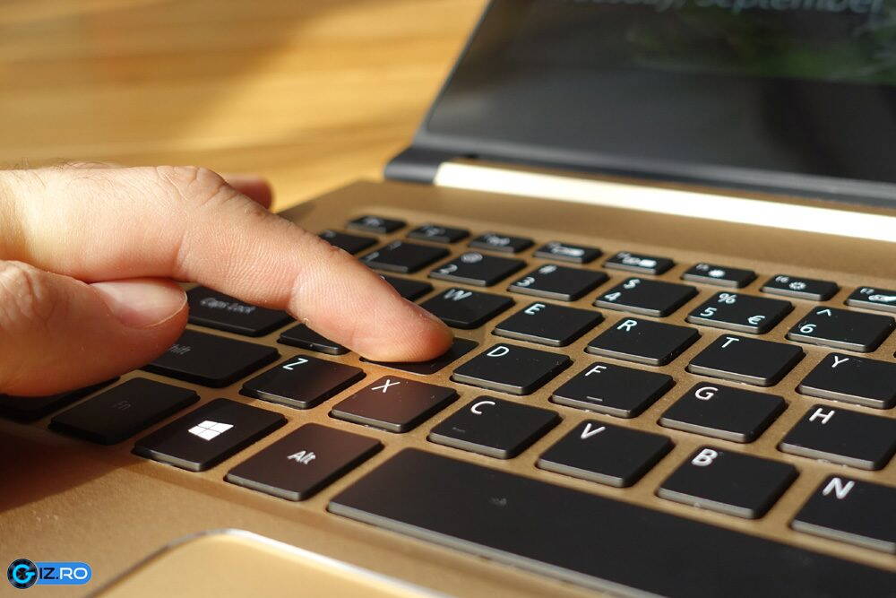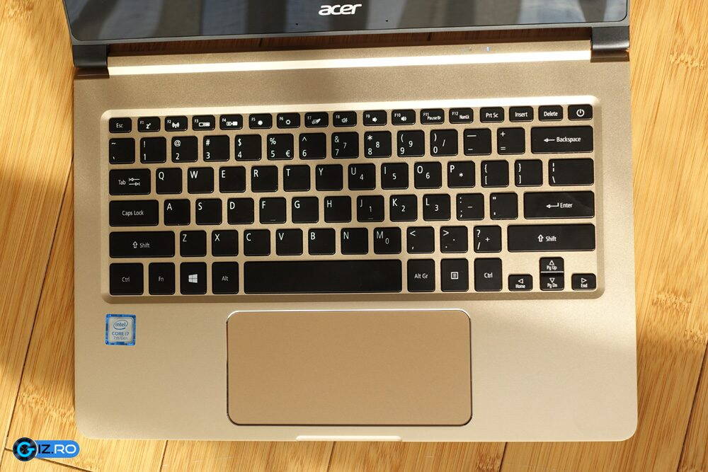 La interior, Acer-ul Swift 7 beneficiază de un trackpad de dimensiuni foarte generoase, de tip Synaptics, ce în cea mai mare parte a timpului a funcţionat bine, inclusiv pentru gesturi, tap-uri şi swipe-uri, însă ocazional cursorul a “sărit”, în special atunci când am vrut să fac un click stânga fizic. Tot ocazional, cursorul a înregistrat dublu-tap în loc de tap.