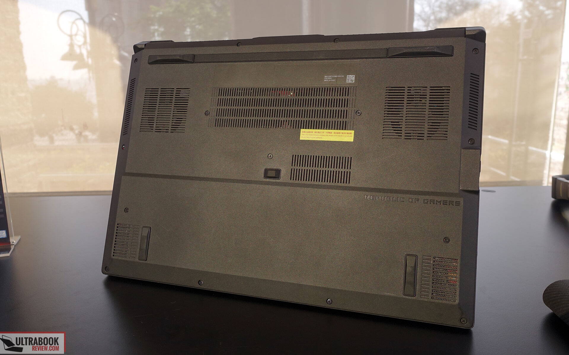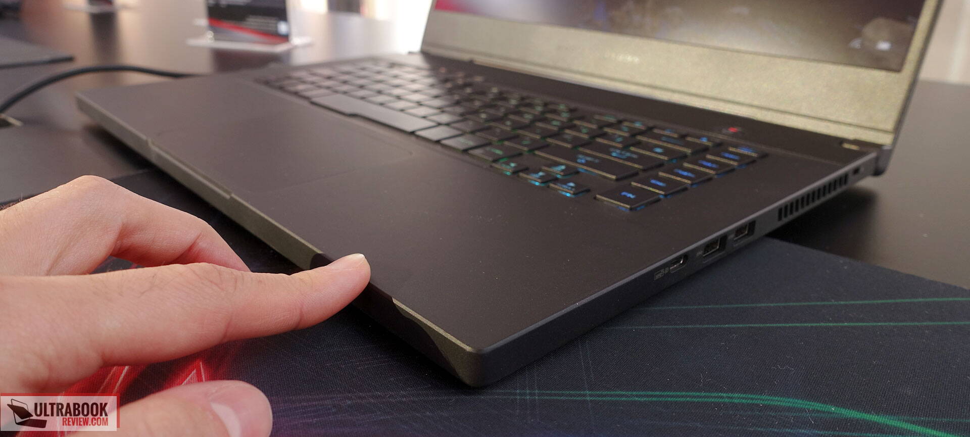 Aliaje de magneziu și aluminiu sunt utilizate în construcția sa, finisajul de pe interior fiind bine închegat, prietenos cu încheieturile și un bun inamic al amprentelor, iar materialul ajutând la obținerea greutății totale de doar circa 2 kg, alături de formatul mai compact decât cel al versiunilor precedente. Acest lucru se observă ușor și după rama subțire din jurul ecranului, după cum am menționat deja mai devreme, însă un ochi atent va observa că GX502-ul nu mai include o cameră web, pentru că Asus au apelat la una externă, conectabilă prin USB și cu un senzor de mai bună calitate.