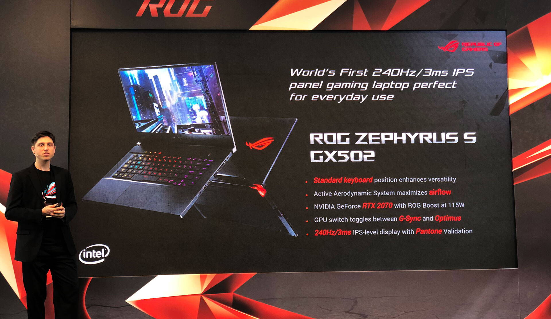 Printre noutăți se numără și utilizarea unui ecran cu rată de refresh de 240 Hz, timp de răspuns sub 3 ms și validare Pantone a culorilor, un model excelent pentru gaming și bunicel pentru utilizarea de zi cu zi. O particularitate importantă a seriei Zephyrus S este modul dual GSync/Optimus, utilizatorul putând opta pentru unul dintre acestea, în funcție de necesități (performanțe în jocuri sau autonomie). Puține alte notebook-uri actuale oferă acest mod dual (Acer Predator Triton, Lenovo Legion Y740), el necesitând un design aparte al hardware-ului pentru a ruta semnalul video de la ambele cipuri grafice (Intel și Nvidia) către ecran.
