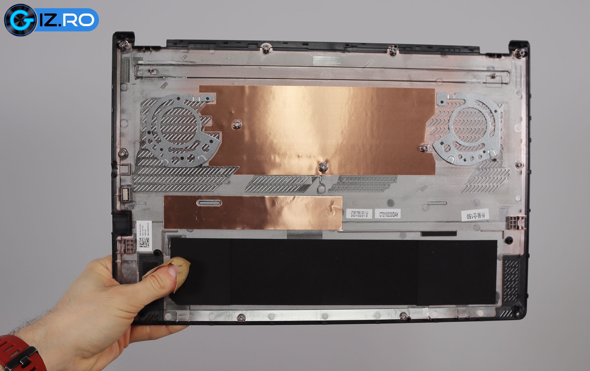 Accesul la componentele interne este facil și necesită doar înlăturarea capacului inferior, singura problemă fiind șuruburile care au dimensiuni diferite și, în cazul a celor trei din centru, sunt și ascunse după piciorușele cauciucate. Utilizatorul va avea acum acces la memoria RAM, stocare, baterie, sistem de răcire și sistem audio.