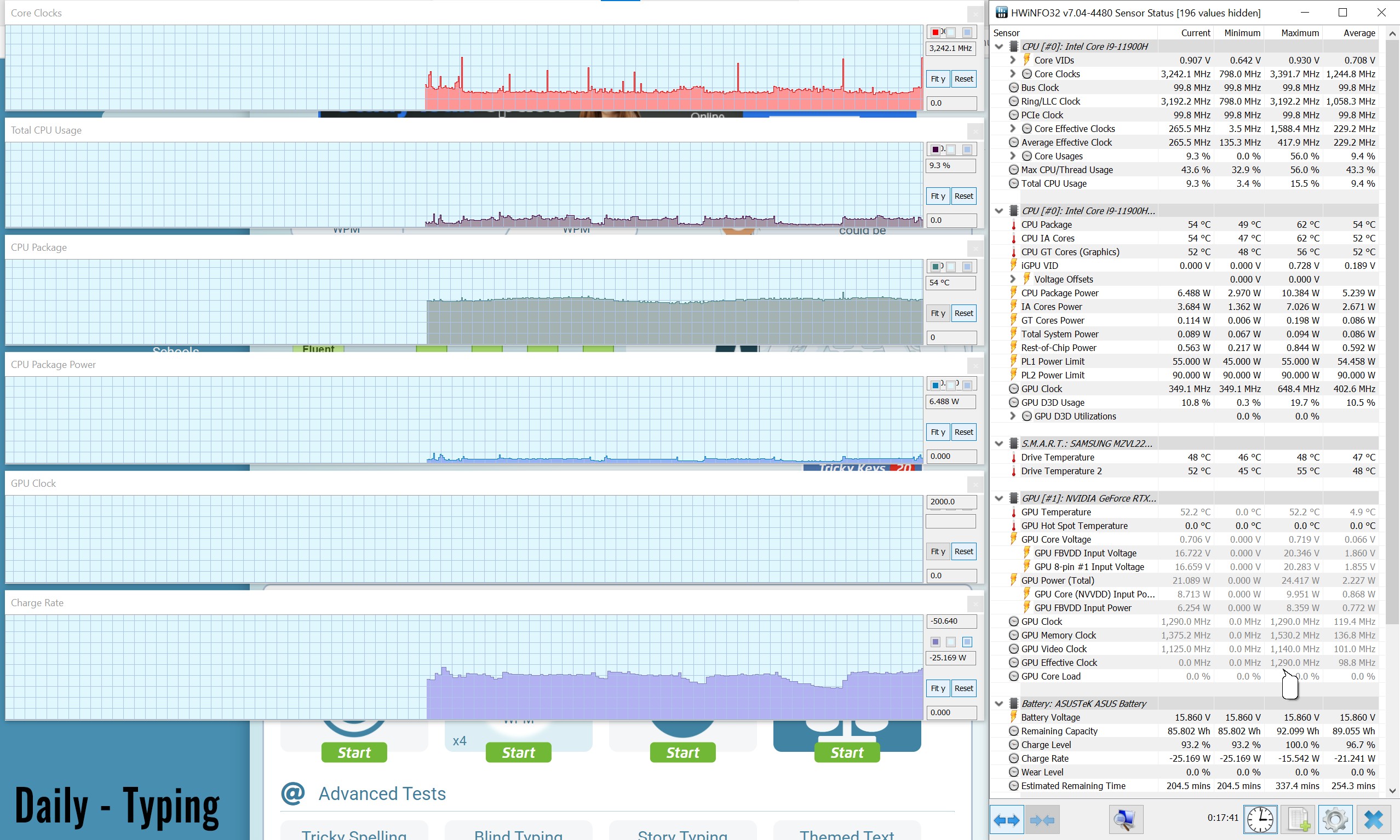 ROG Zephyrus M16 este construit pe fundația oferită de cele mai recente platforme hardware Intel Core H și NVIDIA RTX 3000. Procesorul este Core i9-11900H, unul dintre modelele de vârf Tiger Lake H din cadrul cele de-a 11-a generații Intel Core, acesta oferind 8 nuclee, 16 fire de execuție, frecvențe maxime de 4,9 GHz și un TDP de 45W. Aplicația Armoury Crate oferă mai multe profiluri energetice care îi permit utilizatorului să jongleze cu puterea, temperaturile și nivelul de zgomot, și, după cum vom vedea, procesorul este capabil să atingă frecvențe ridicate cam în toate scenariile. Această generație Intel Core mai aduce Thunderbolt 4, PCIe gen 4, performanțe mai bune per ciclu de tact și altele.