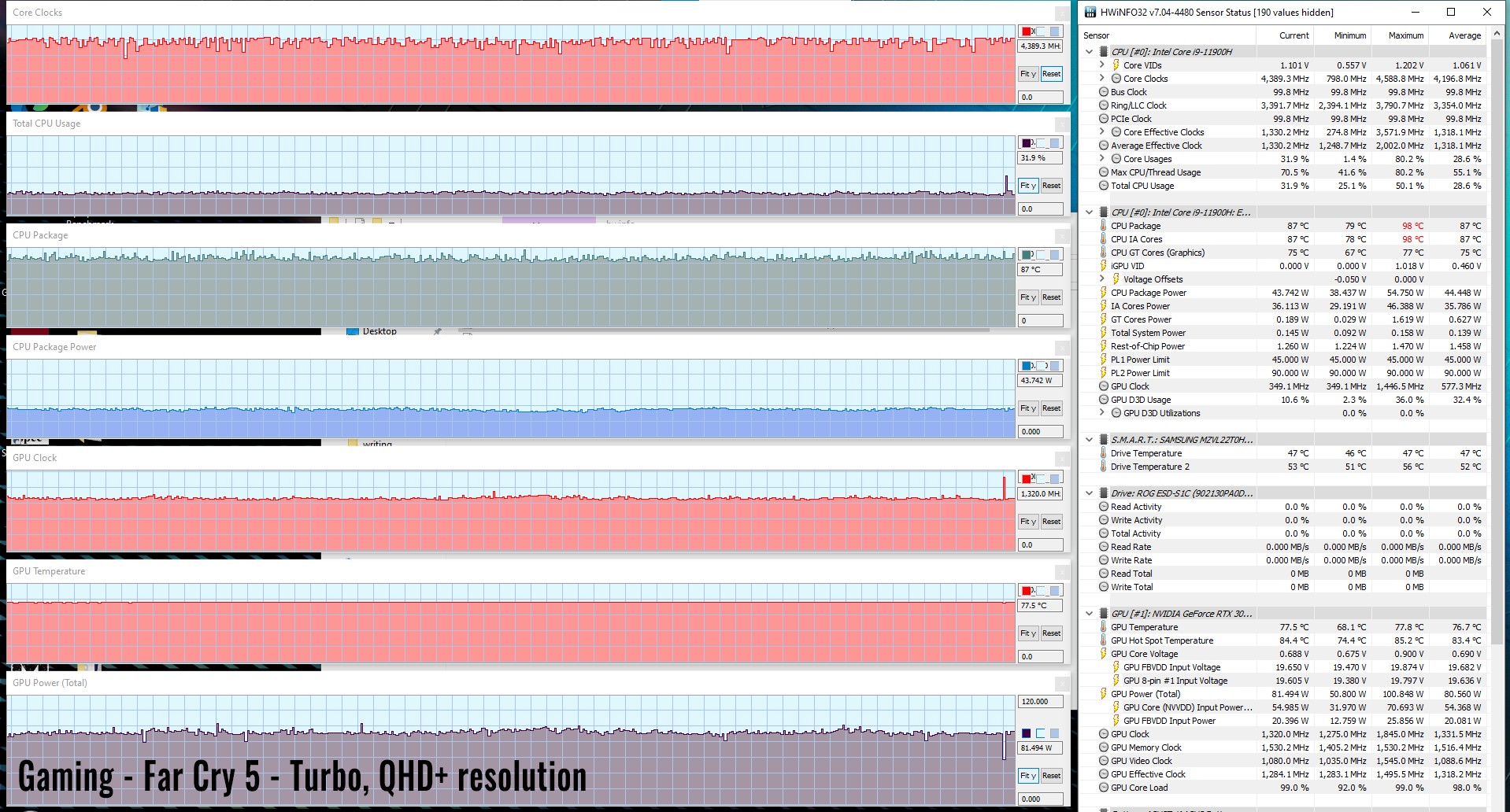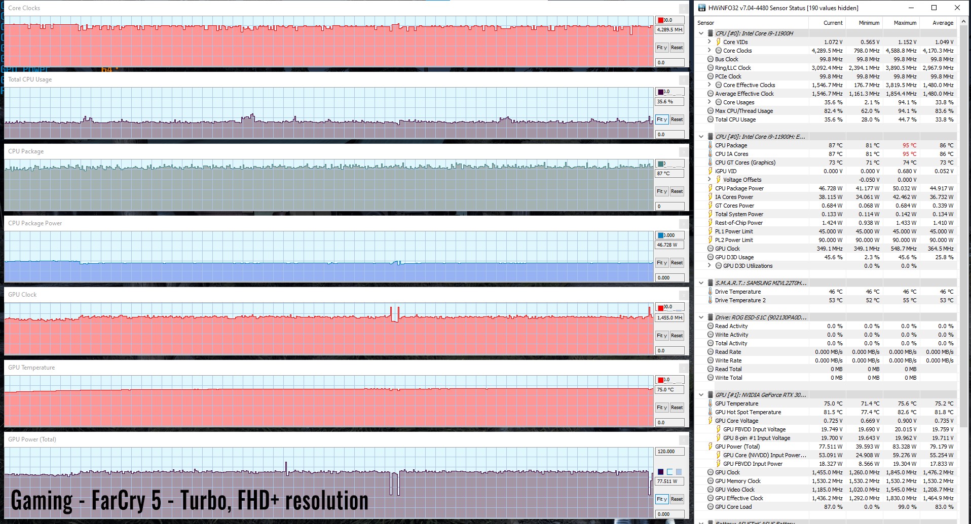 Performanțele sunt ridicate iar temperaturile sunt bune în toate testele. În jocurile care sunt compatibile cu Dynamic Boost 2, cum ar fi SOTTR sau Cyberpunk 2077, placa video primește circa 100W iar temperaturile pe CPU și GPU urcă puțin peste 75 de grade. În jocurile în care Dynamic Boost este mai puțin util, cum ar fi Far Cry 5 sau Battlefield 5, temperaturile pe procesor depășesc însă ocazional 85 de grade.