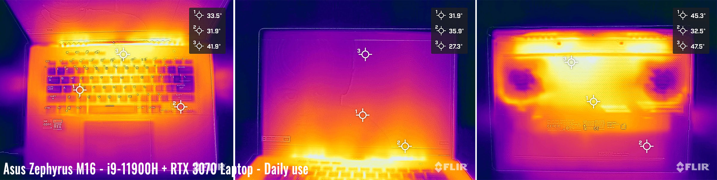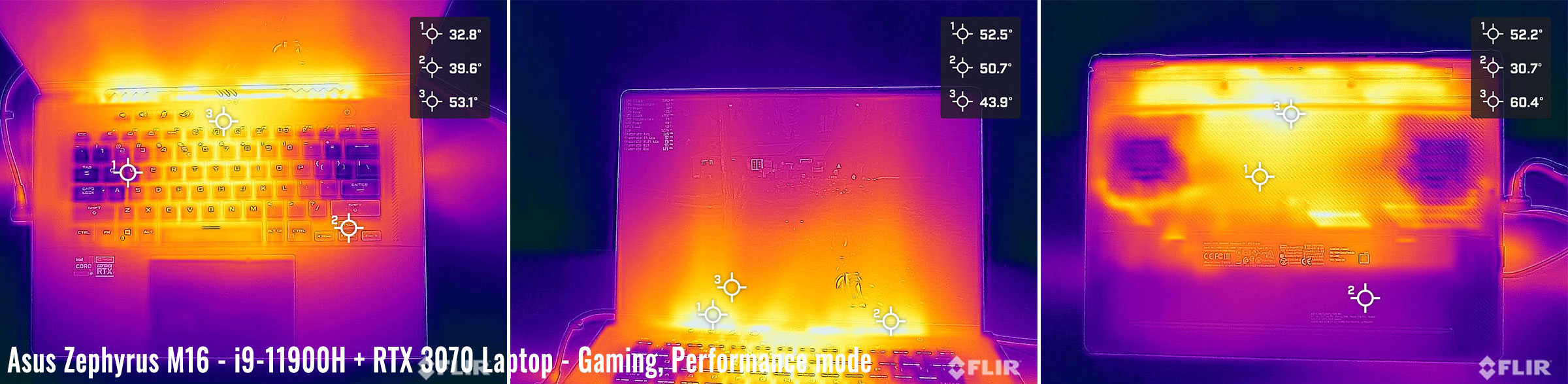 Zephyrus M16 este și mai zgomotos decât alte laptopuri similare, însă temperaturile sale interne ajung la cel mult 85 de grade, cu zece grade mai puțin decât în cazul Ryzen 9 din Zephyrus G15 sau G14.