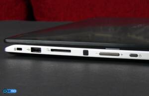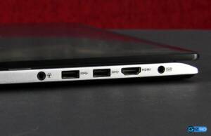 Pe părţile laterale ale ultrabook-ului vei regăsi deja familiarele porturi USB 3.0 în trei exemplare, un port HDMI şi un slot pentru citirea cardurilor SD, dar şi butonul de volum, un buton pentru sistemul de operare Windows şi controlul volumului.