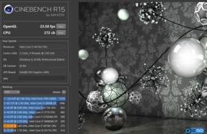 - CineBench R15: OpenGL 23.58 fps, CPU 272 cb.
