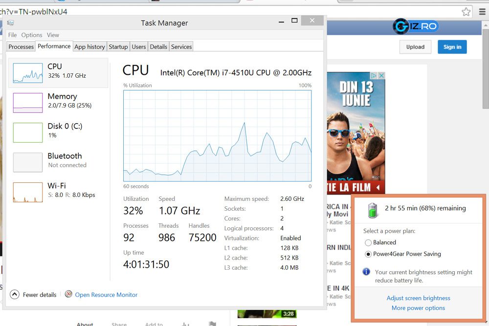 Dacă vrei mai mult de 6 ore, poţi apela la modul extrem Power4Gear Energy Saving. Din păcate, activarea acestuia determină o scădere majoră a frecvenţei procesorului, iar ultrabook-ul se va mişca prea lent chiar şi în activităţile de rutină.