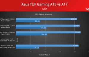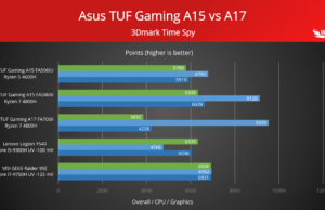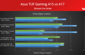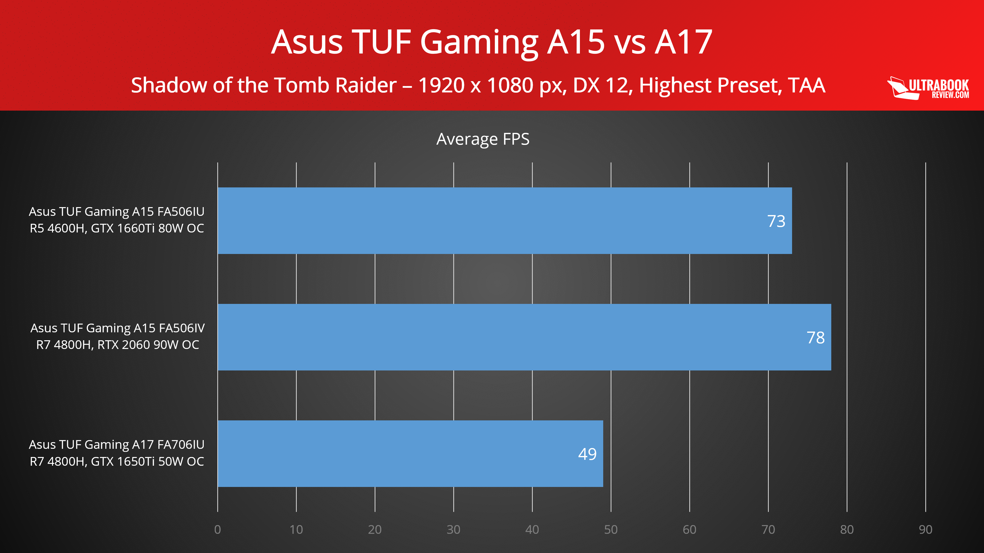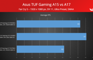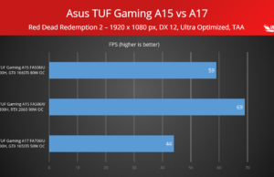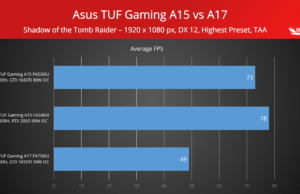 Cipul RTX 2060 este disponibil doar pe modelul TUF A15 cu ecran de 15-inch, și nu și pe versiunea cu ecran mai mare, cel puțin pentru moment. Acesta oferă un spor de performanțe în jocuri, după cum puteți vedea în tabelul de mai jos, în care am inclus toate cele trei cipuri Nvidia disponibil pe seria TUF A15/A17 din această generație.