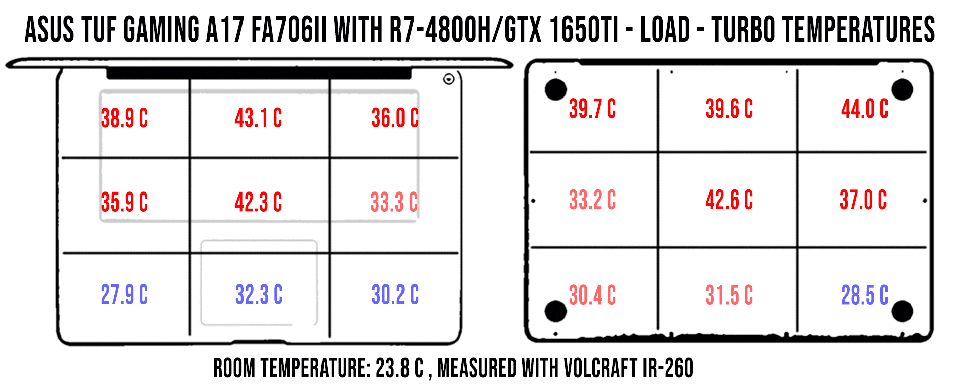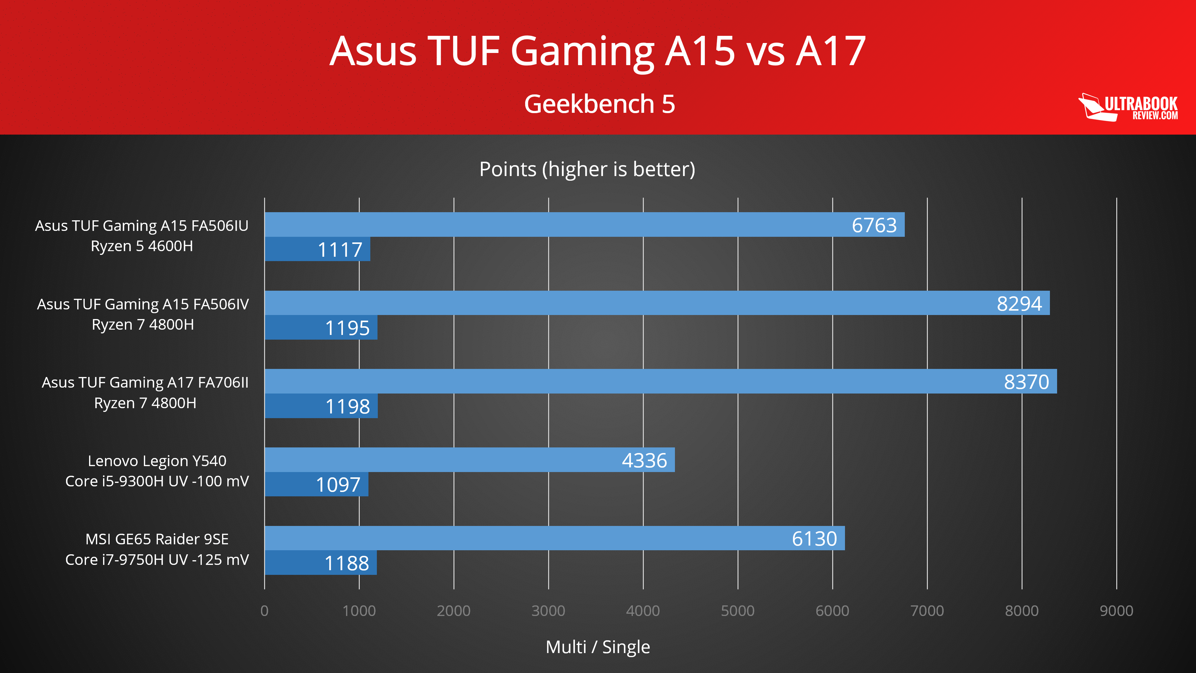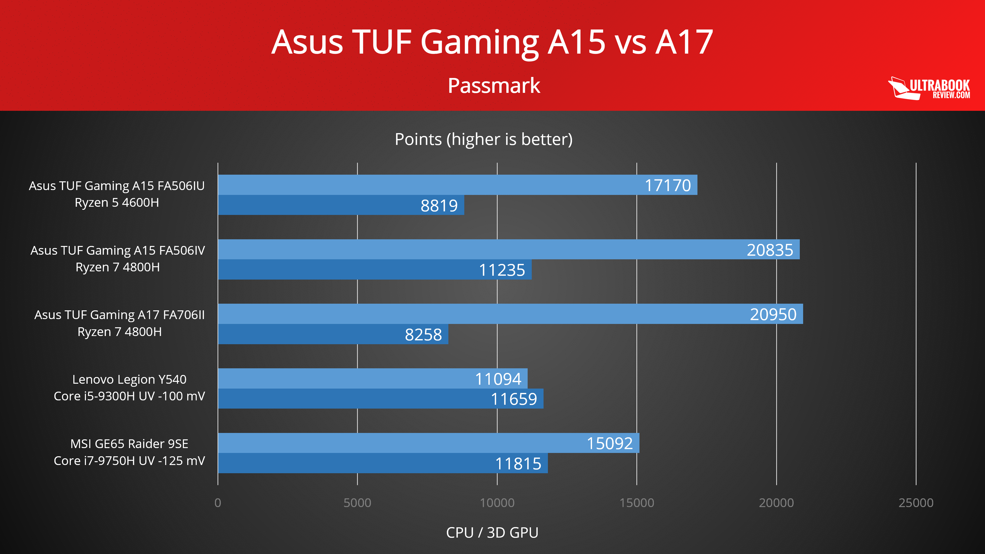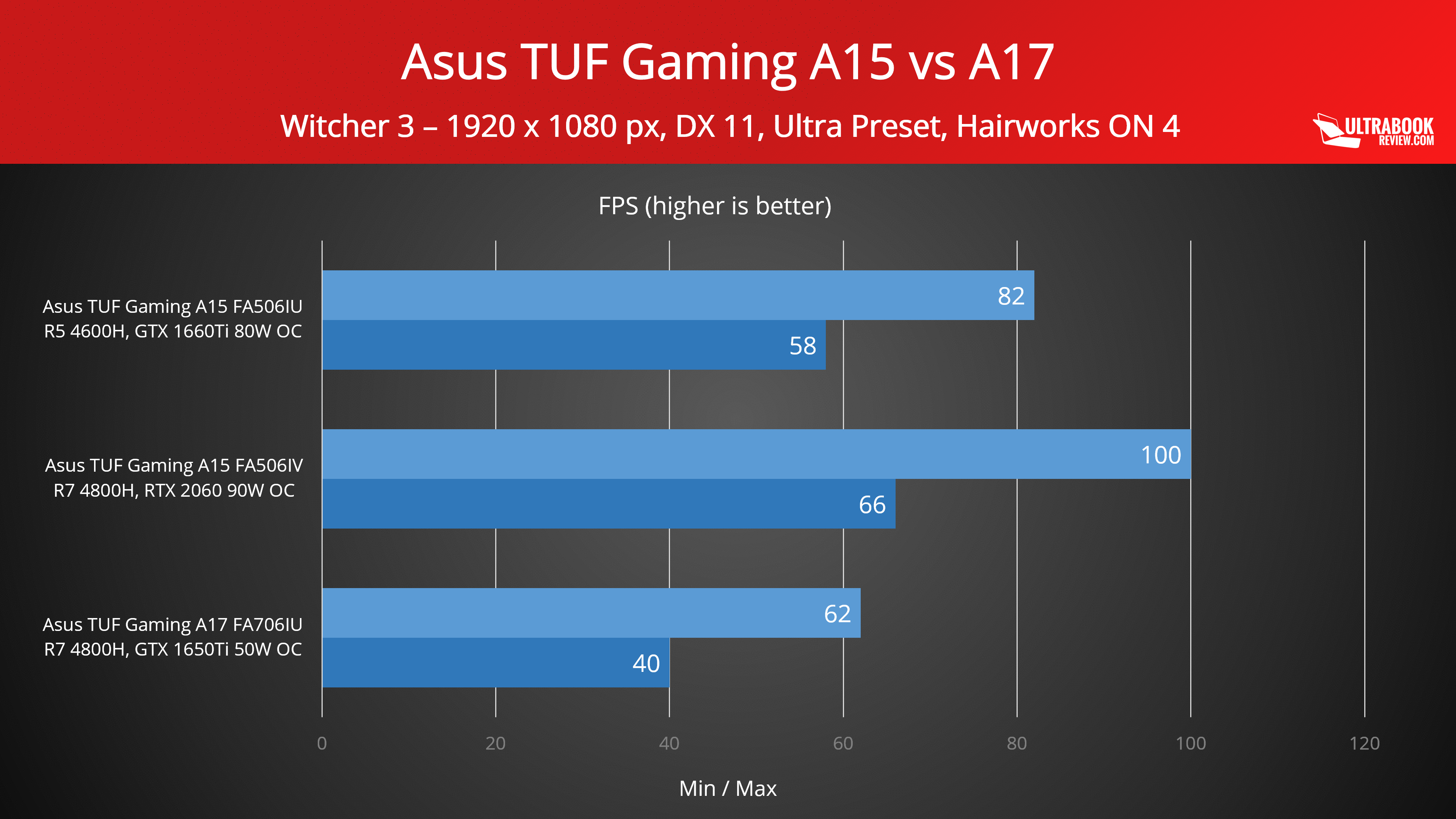 - TUF A17 FA706II – Ryzen 7 4800H + GTX 1650Ti 50W, Turbo: Far Cry 5 (93 CPU, 70 GPU), Witcher 3 (87 CPU, 70 GPU)