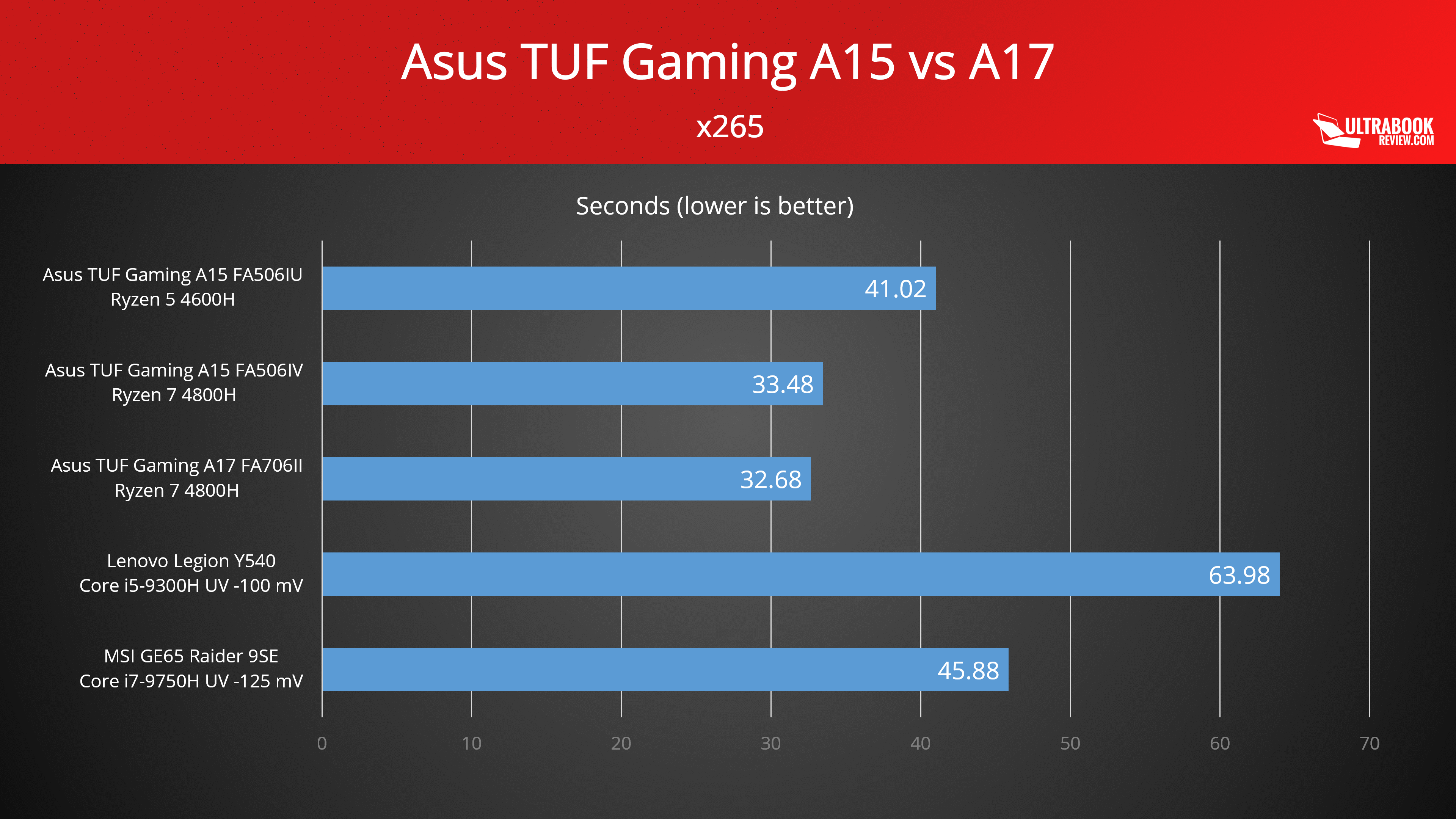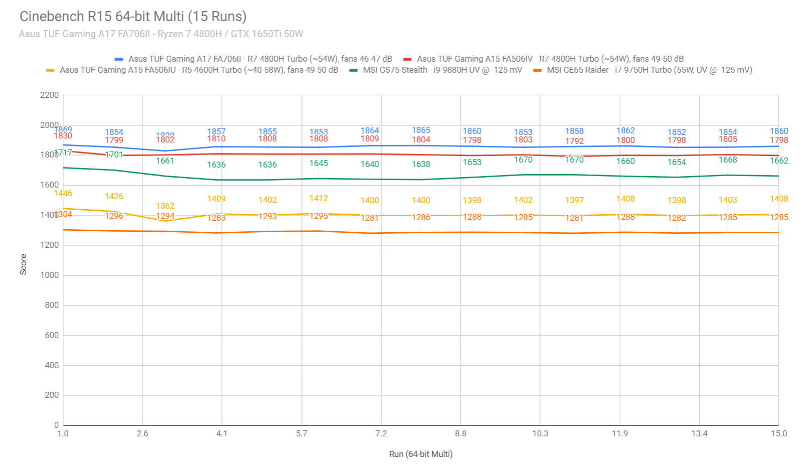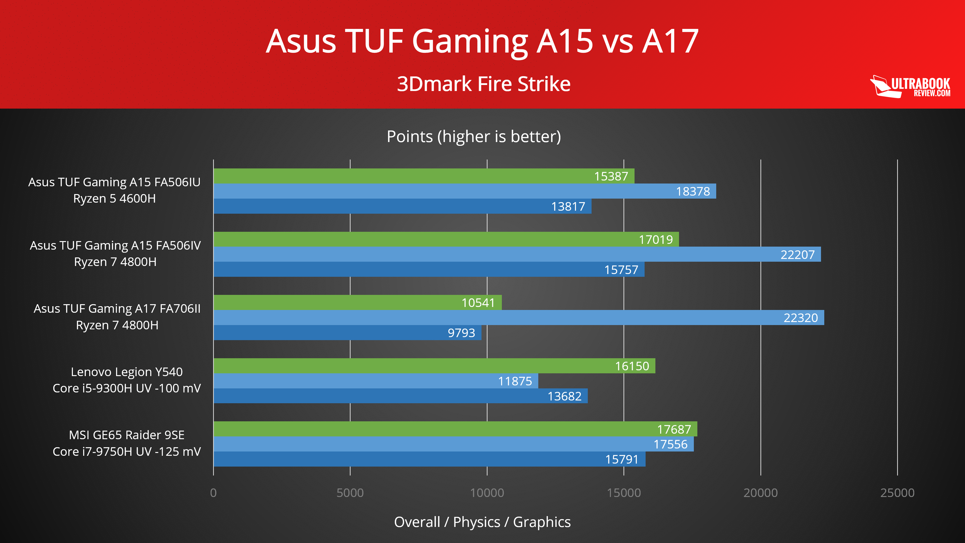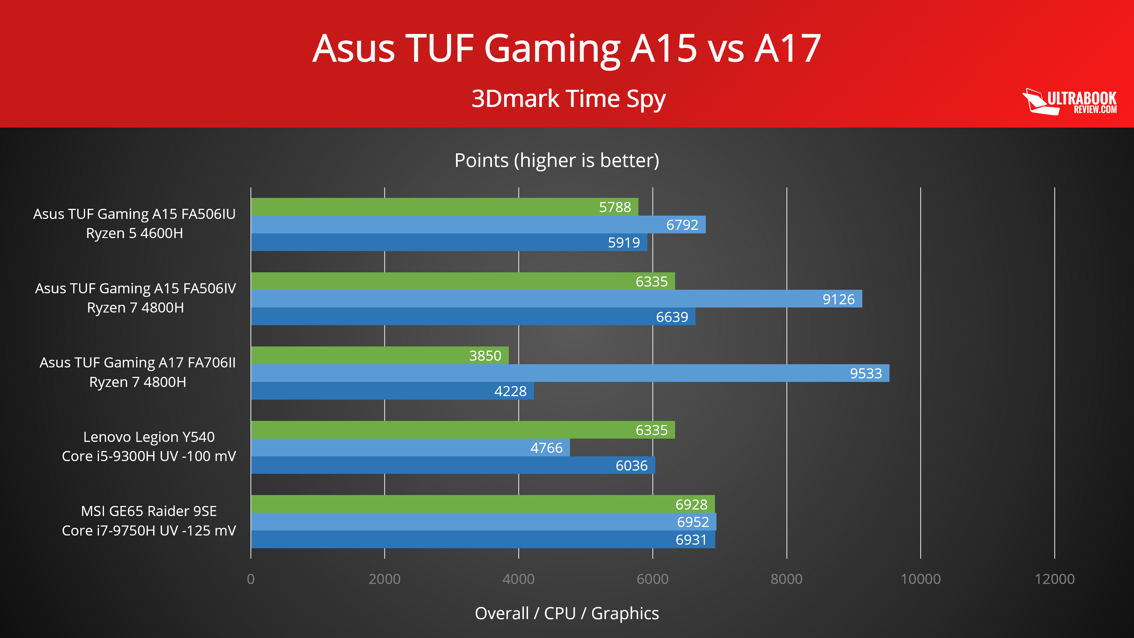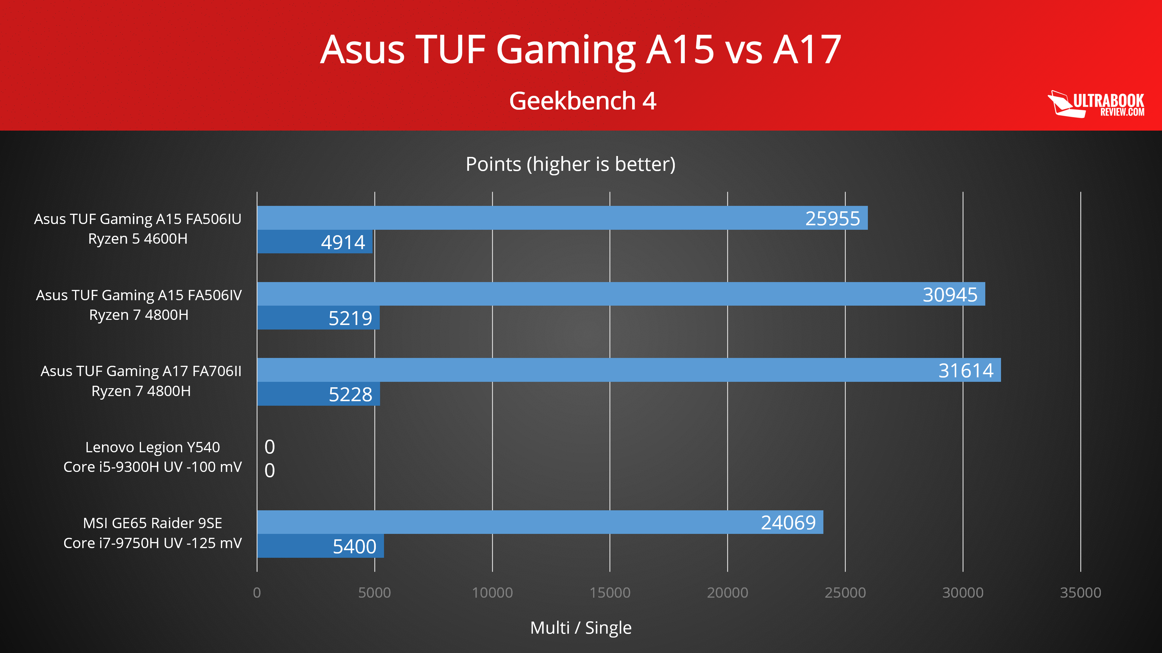 - TUF A17 FA706II – Ryzen 7 4800H + GTX 1650Ti 50W, Turbo: Far Cry 5 (93 CPU, 70 GPU), Witcher 3 (87 CPU, 70 GPU)