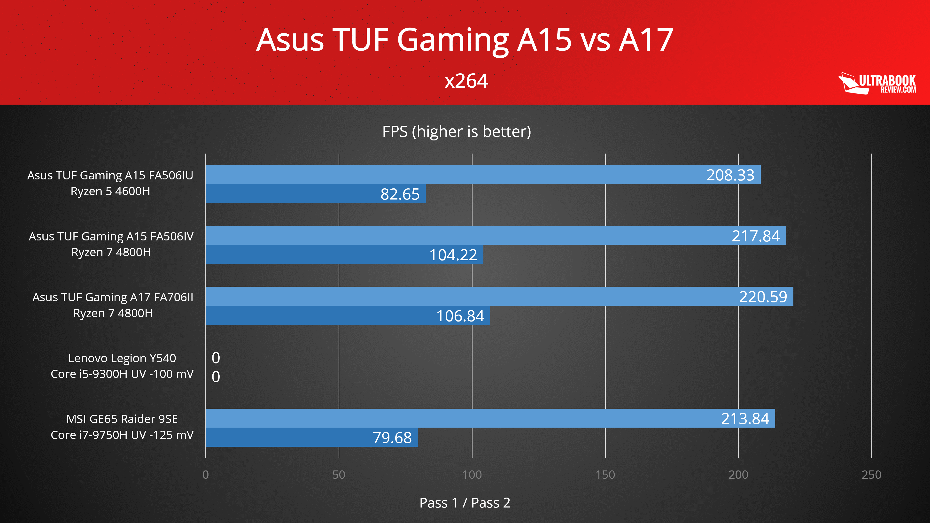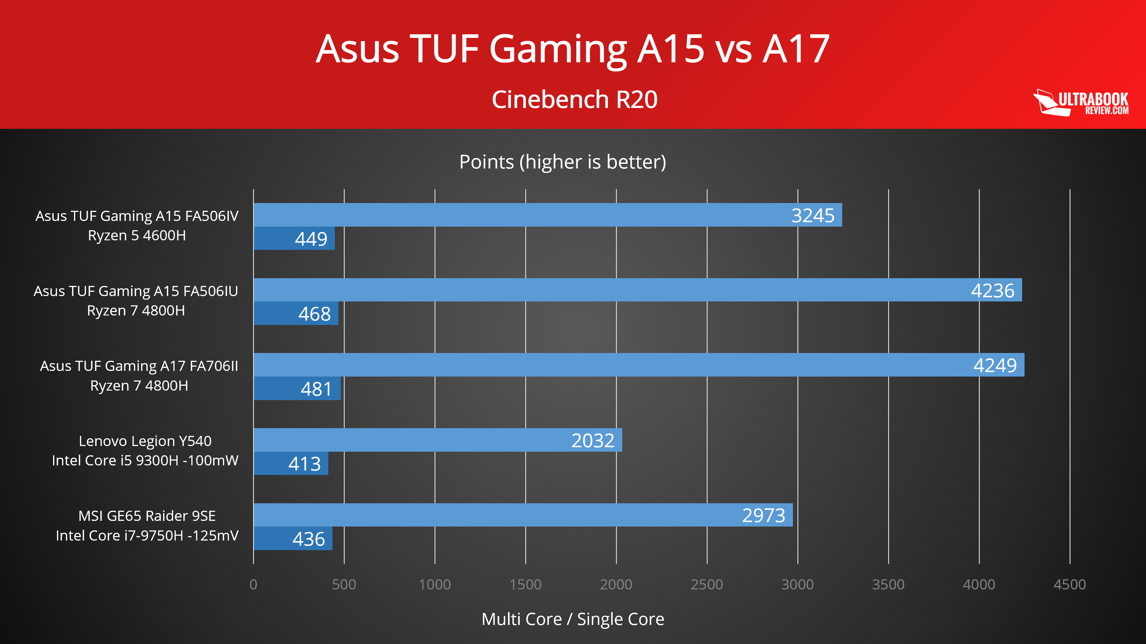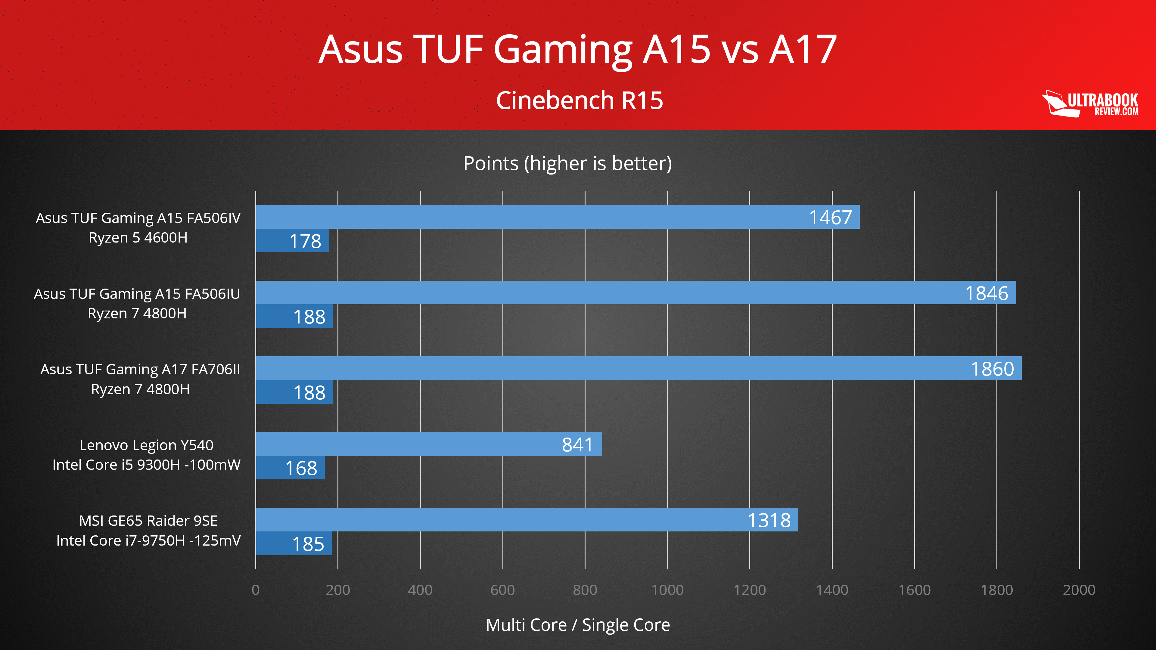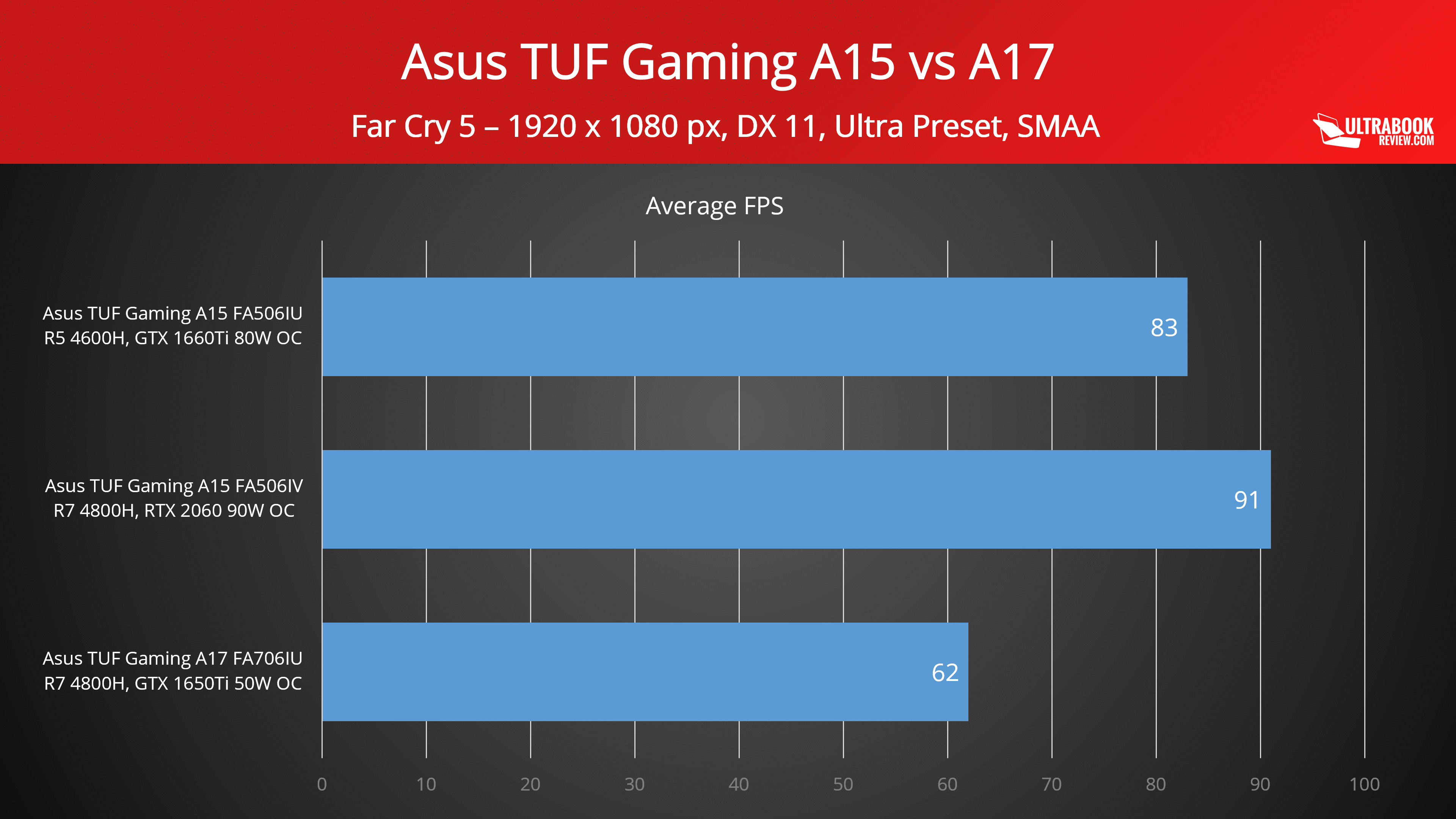 - TUF A15 FA506IV – Ryzen 7 4800H + RTX 2060 90W, Turbo: Far Cry 5 (95 CPU, 78 GPU), Witcher 3 (92 CPU, 79 GPU);