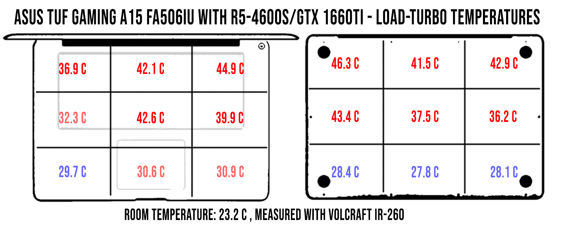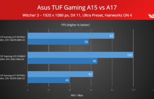 - TUF A15 FA506IU – Ryzen 5 4600H + GTX 1660Ti 80W, Turbo: Far Cry 5 (94 CPU, 78 GPU), Witcher 3 (90 CPU, 75 GPU);