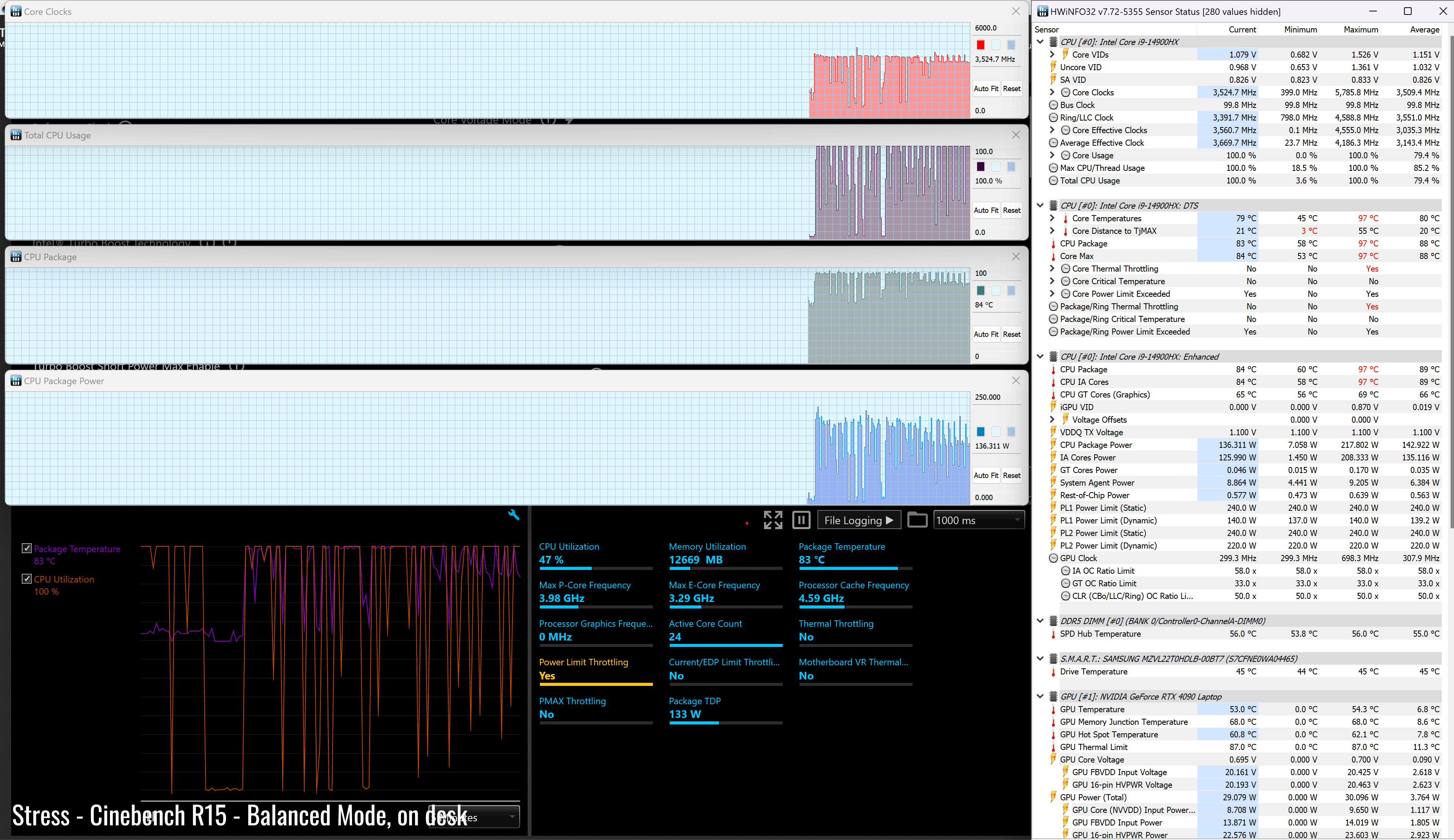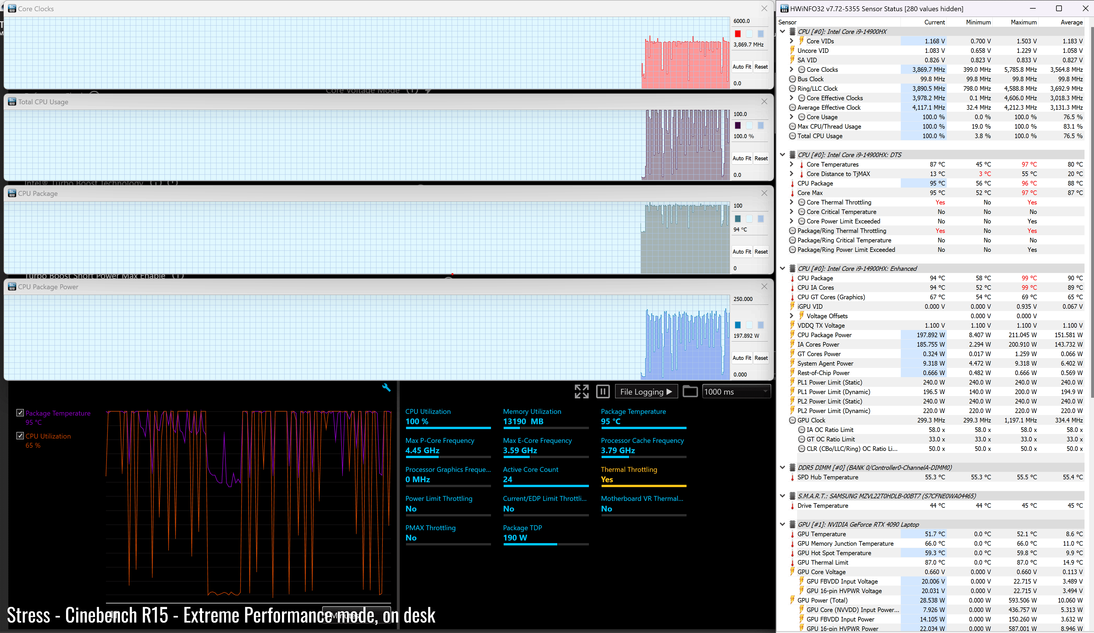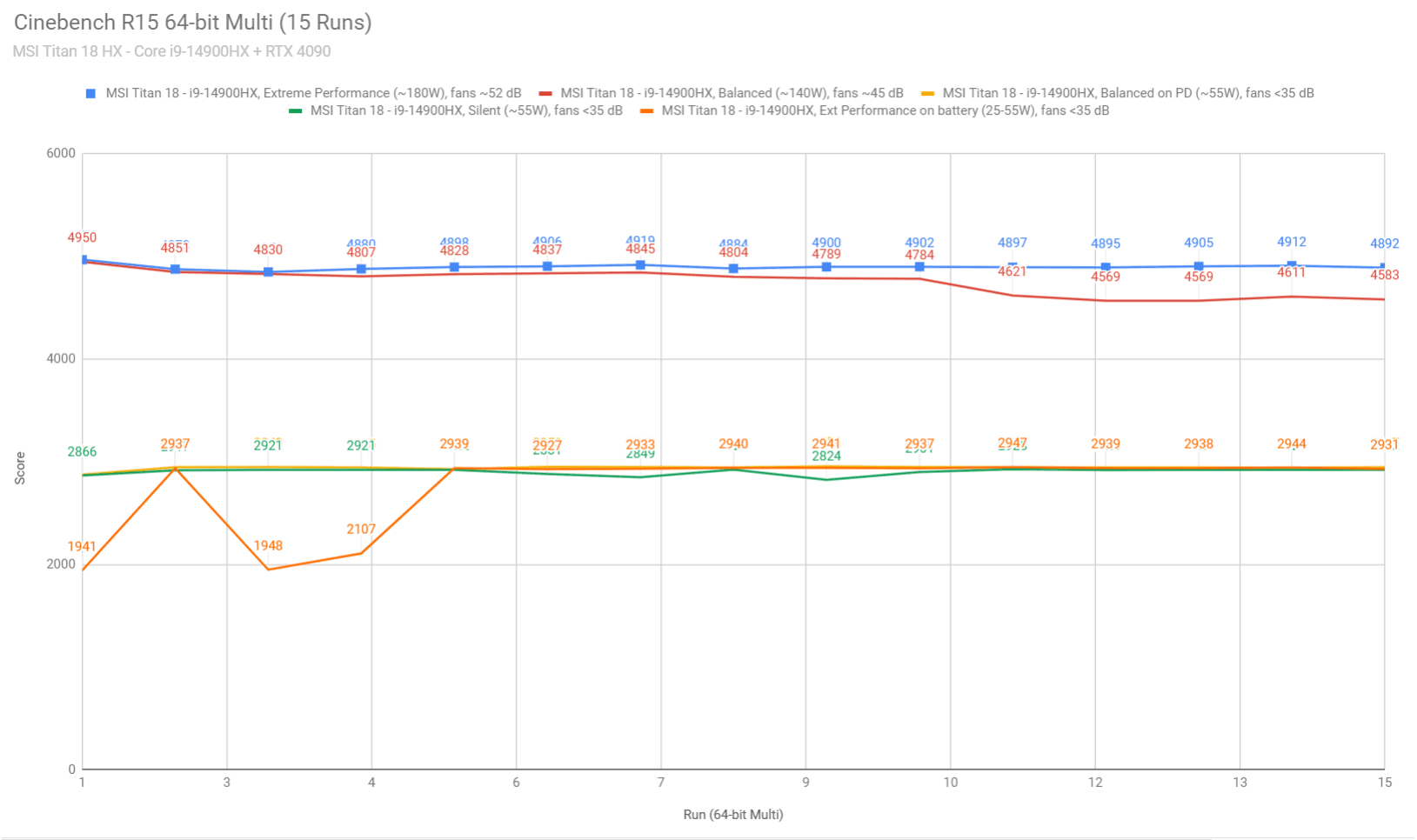 Procesorul Core i9-14900HX se stabilizează la o putere susținută de ~180W pe setarea Extreme, cu ventilatoarele setate pe Auto și laptopul așezat plat pe birou, cu temperaturi de aproximativ 93-95 C și scoruri de ~4900 puncte. Ventilatoarele se rotesc la ~52 dB la nivelul capului în acest mod.