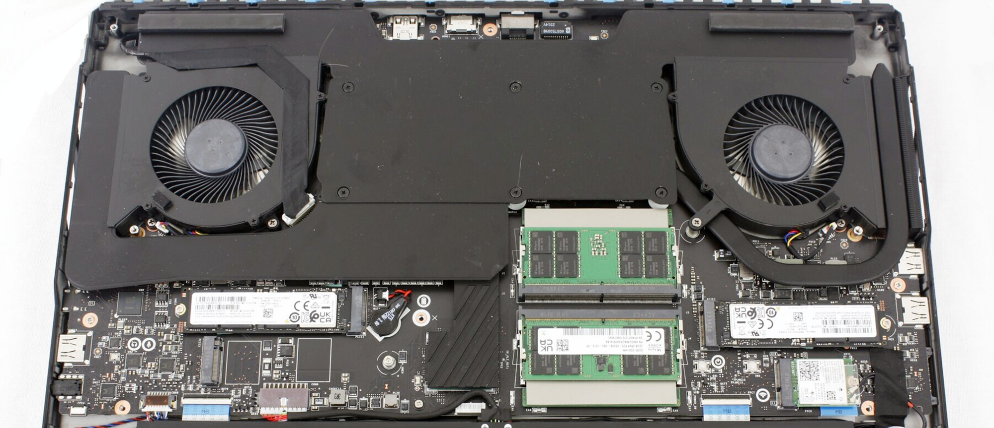 În ceea ce privește opțiunile de memorie RAM și de stocare, laptopul vine cu patru sloturi DIMM și trei sloturi pentru SSD M.2 2280. Pentru că este vorba de o configurație de 4x RAM, memoria funcționează doar la viteze DDR5-4000, chiar dacă laptopul este livrat cu module DDR5-5200 sau 5600. Acest lucru nu ar trebui să conteze pentru majoritatea aplicațiilor, dar ar putea totuși să conteze pentru anumite aplicații care depind foarte mult de vitezele RAM.