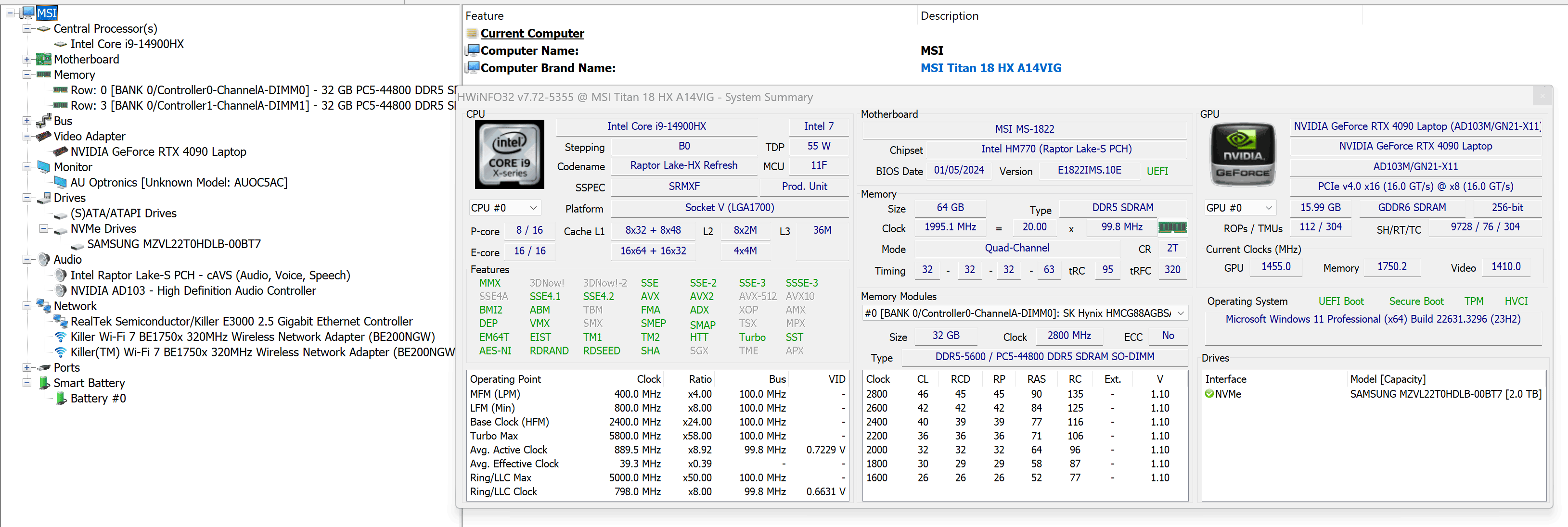 Modelul nostru de test este configurația de top a seriei MSI Titan 18 HX, construită pe un procesor Intel Core i9-14900HX, 64 GB de memorie DDR5-5600, 2 TB de stocare SSD și o grafică duală: Nvidia RTX 4090 16GB dGPU și Intel UHD iGPU integrată în procesorul Intel.