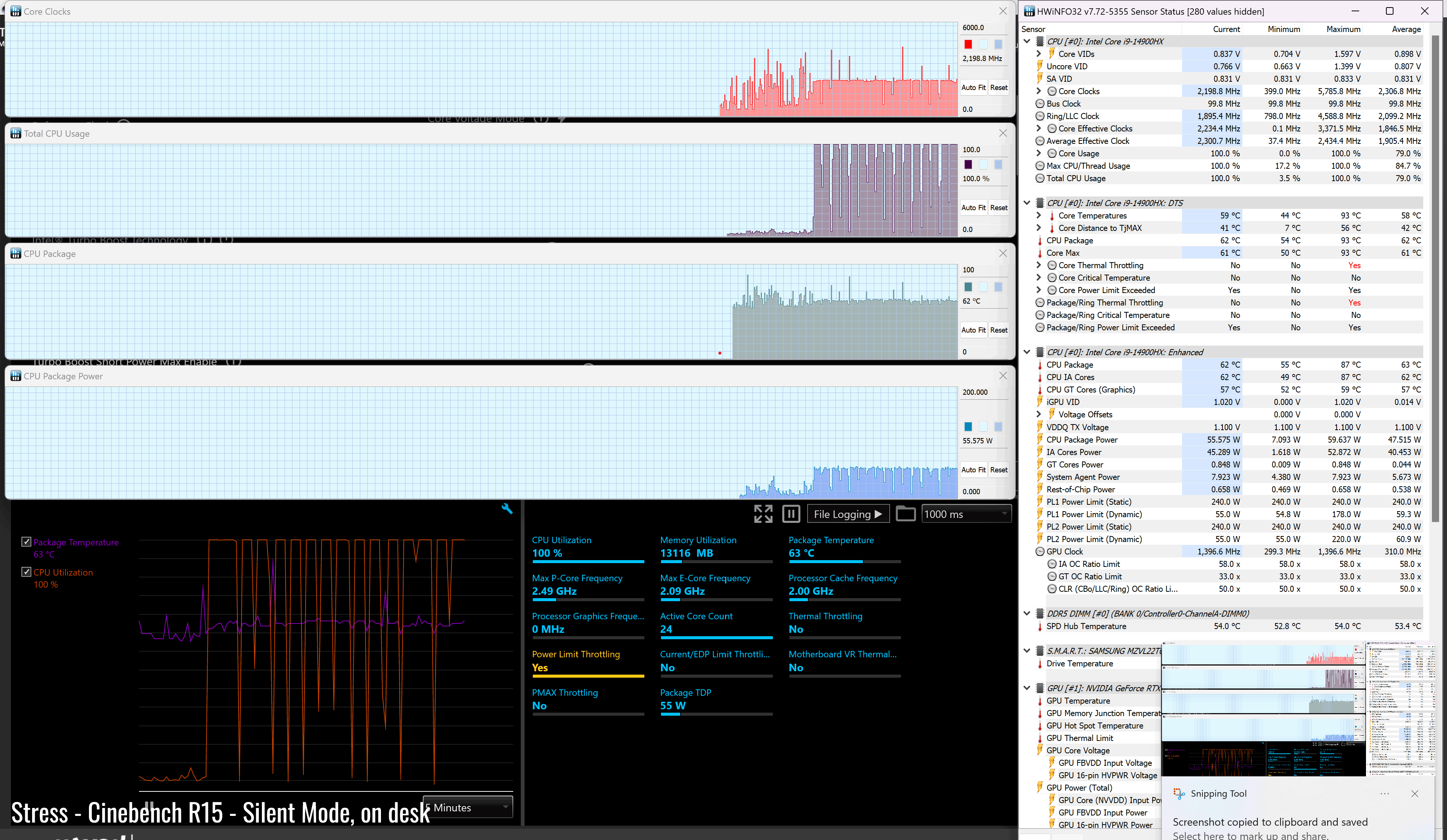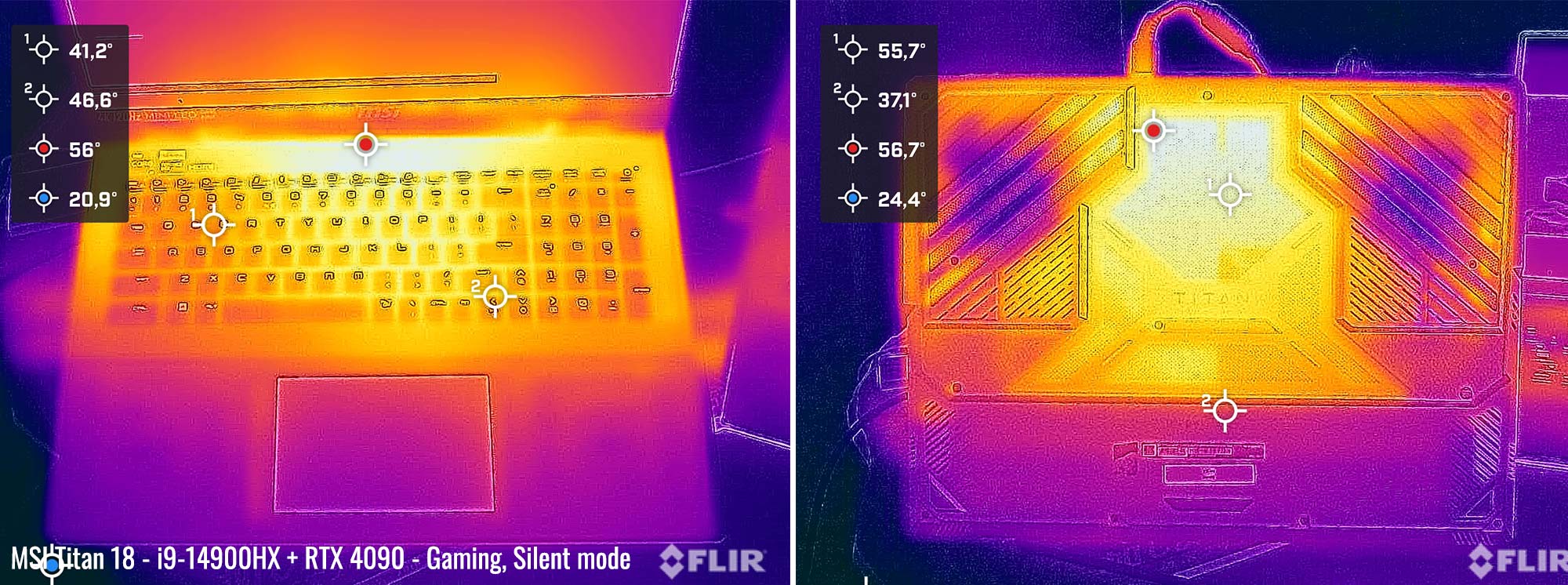 Pe profilul Silent, însă, procesorul este limitat la 55W, cu ventilatoare abia auzibile (sub 35 dB) și temperaturi în jurul a 60 de grade Celsius. i9-14900HX obține ~3000 de puncte în testul Cinebench, aproximativ 60% din performanța din modul Extreme. Este bine pentru un profil silențios, dar mai agresiv limitat decât în cazul altor implementări ale acestei platforme, deoarece temperaturile ar permite cu ușurință o limită mai mare, în jurul a 75W sau cam așa ceva, ceea ce ar asigura scoruri în jurul a 3600 de puncte.