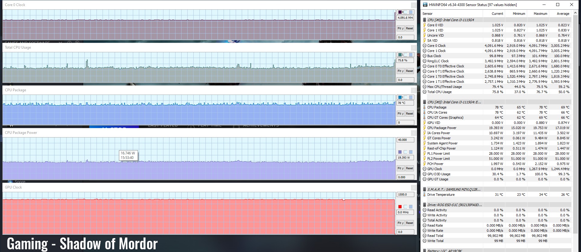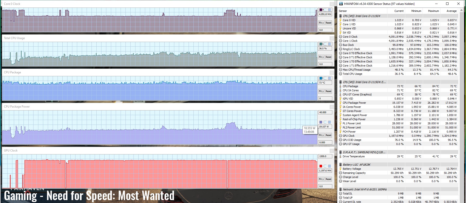 După cum se vede, Aspire 5 cu procesorul Core i3 abia face față în jocurile mai vechi sau mai puțin pretențioase, și nu poate face față produselor majore moderne. HWInfo arată că procesorul se stabilizează la un TDP de 17W și temperaturi rezonabile în majoritatea cazurilor, excepția fiind FarCry 5, unde au fost atinse frecvențe, niveluri de putere și temperaturi vizibil mai ridicate.