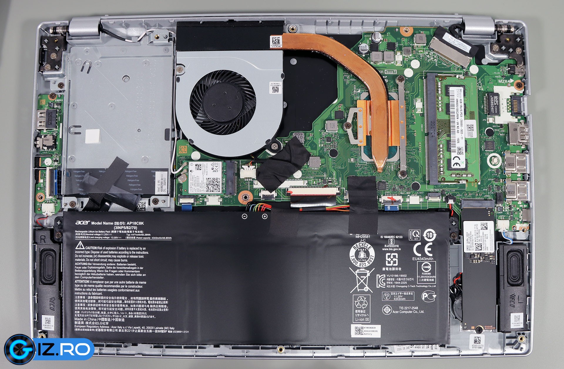 Configurația mai include 8 GB de memorie DDR4 2666 și un SSD cu conectare PCIE4x de la Samsung. Ambele pot fi accesate și schimbate prin simpla înlăturare a capacului inferior. 4 GB de memorie sunt lipiți pe placa de bază, însă ceilalți 4 folosesc un slot standard și pot fi schimbați. Laptopul mai oferă un slot M.2 și un locaș de 2,5” cu cablurile deja pregătite care poate găzdui un SSD sau HDD. Aspire 5 este astfel unul dintre puținele ultrabook-uri de 14” care permite adăugarea de memorie sau a unei unități suplimentare de stocare, un avantaj pentru unii utilizatori.