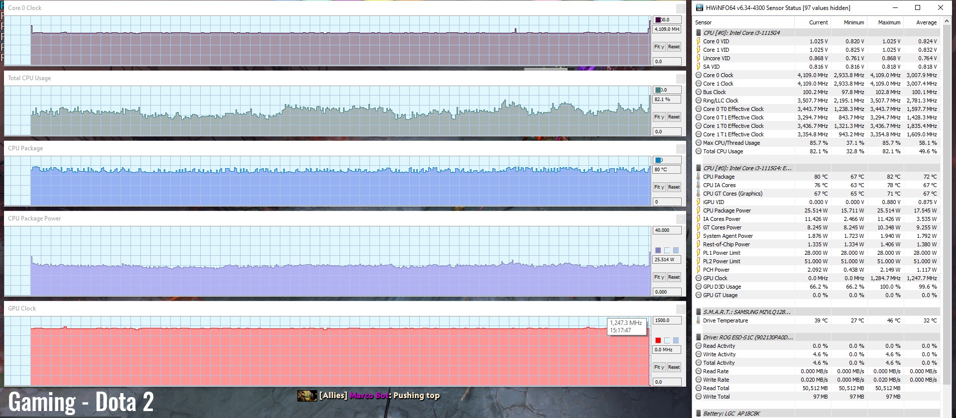 | Dota 2 (DX 11, Best Looking Preset) | 30 fps (23 fps – 1% low) | 73 fps (44 fps – 1% low) | 71 fps (46 fps – 1% low) | 56 fps (44 fps – 1% low) | 34 fps (20 fps – 1% low) | 39 fps (28 fps – 1% low) |