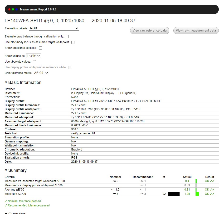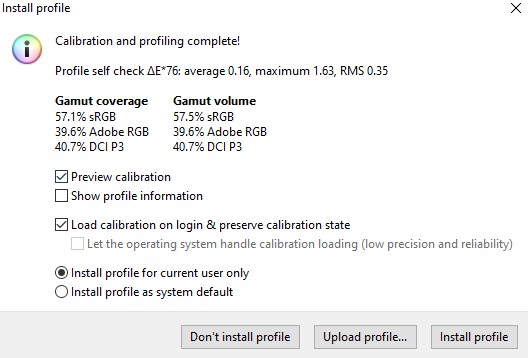 - Coverage: 57.1% sRGB, 39.6% AdobeRGB, 40.7% DCI-P3;