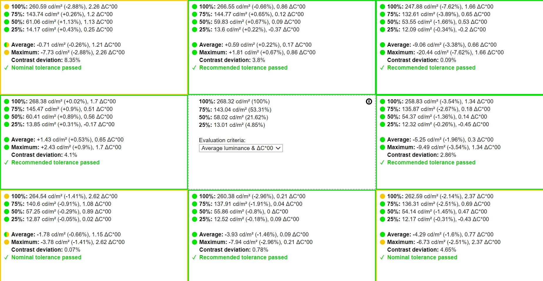 - Min brightness in the middle of the screen: 23.42 cd/m2 on power;