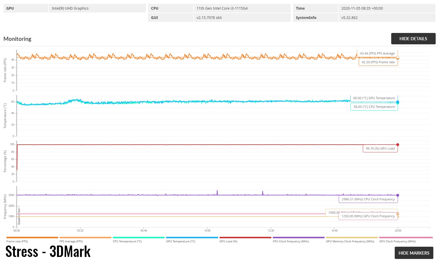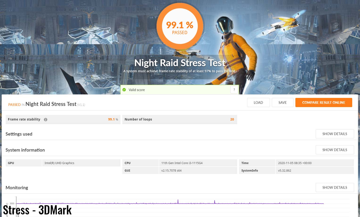 Am trecut apoi la testul de stabilitate 3DMark Stress Test, pe care laptopul l-a trecut fără probleme, deci performanța nu ar trebui să se degradeze nici în sesiunile lungi de lucru.