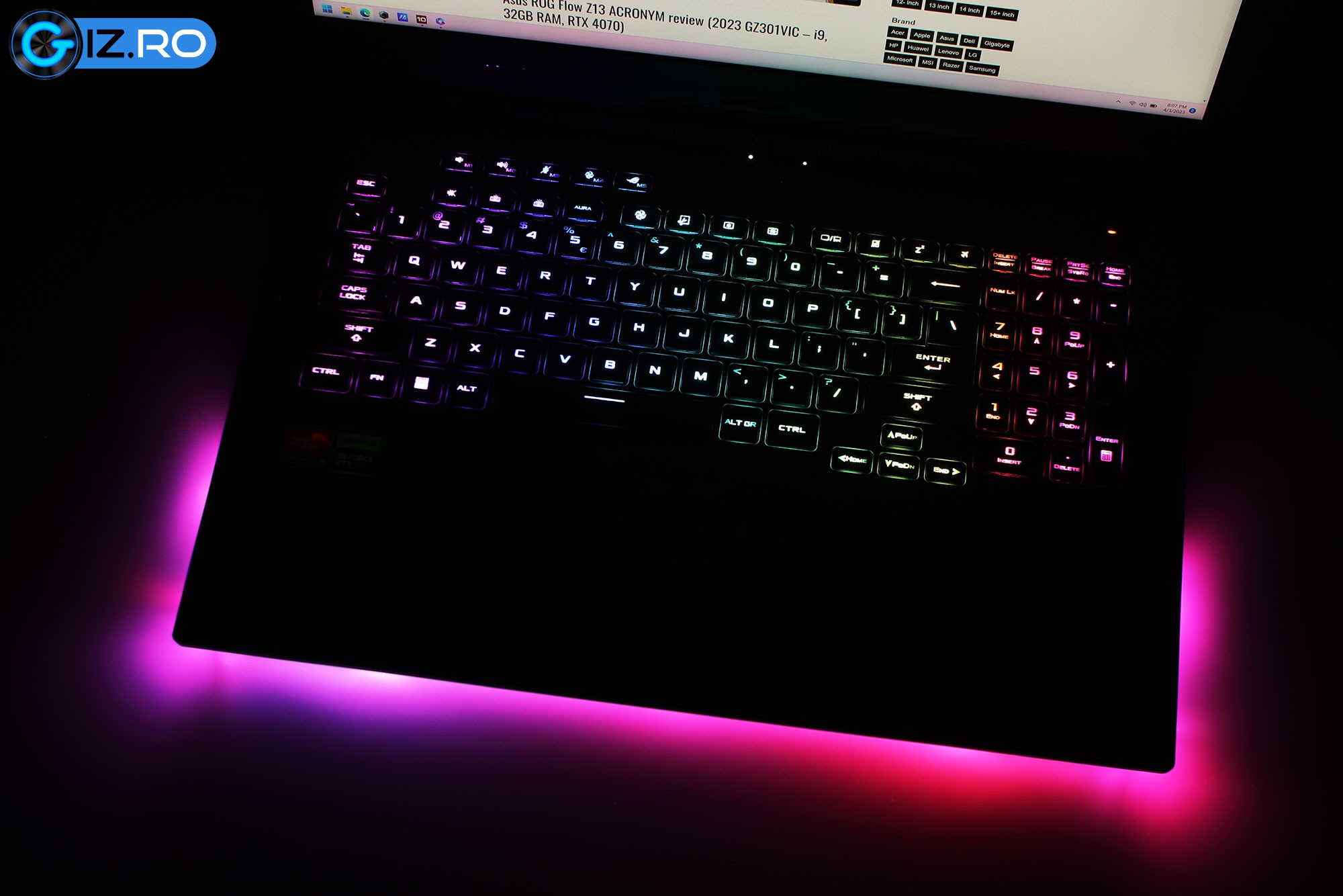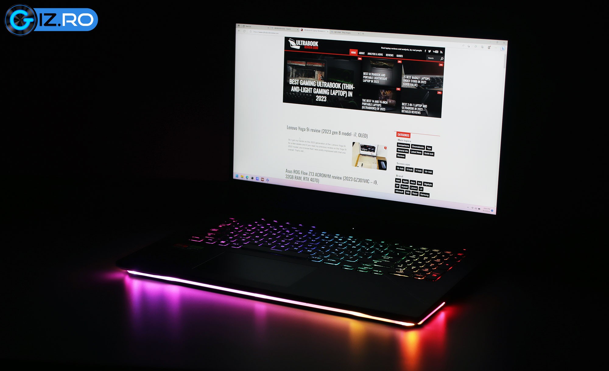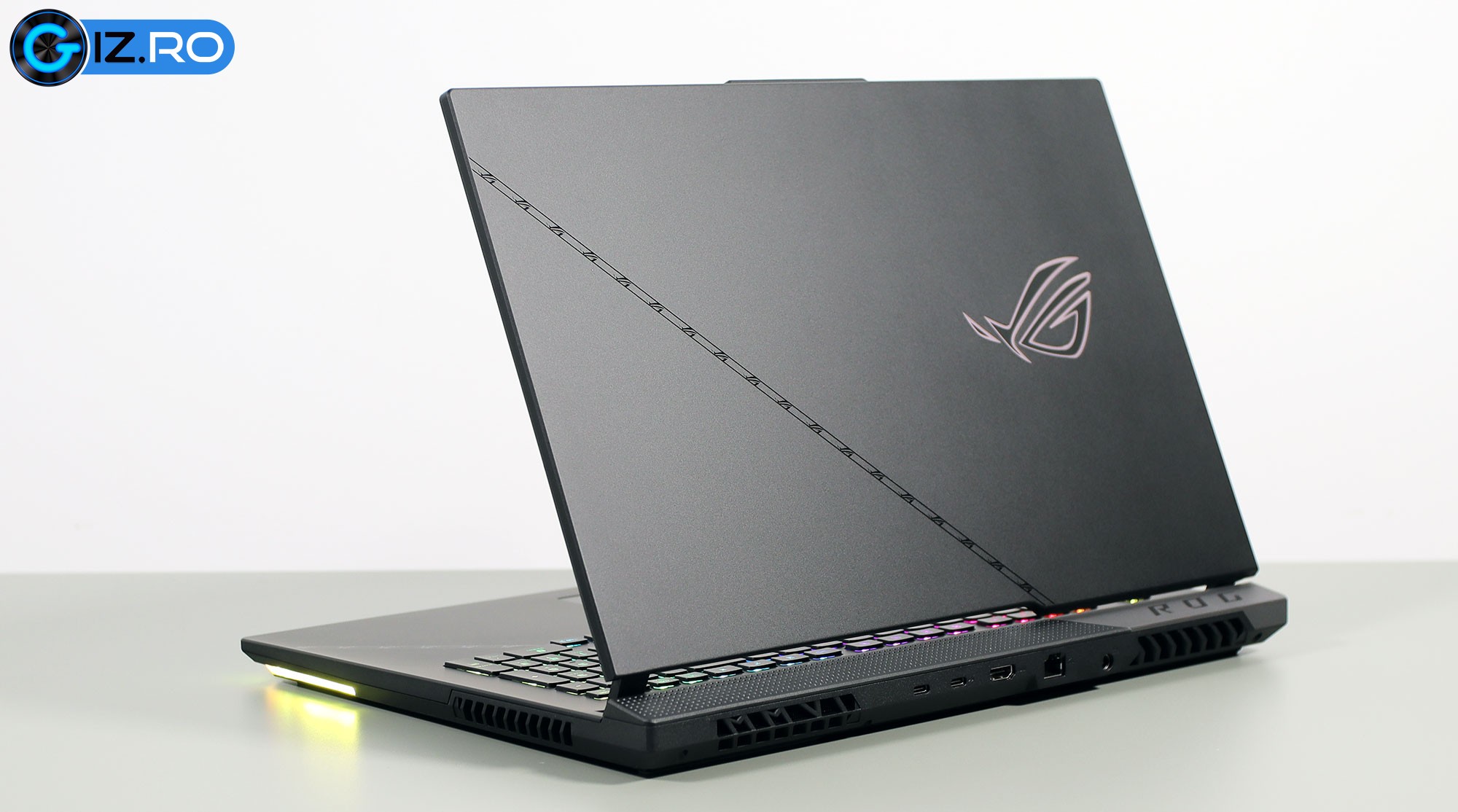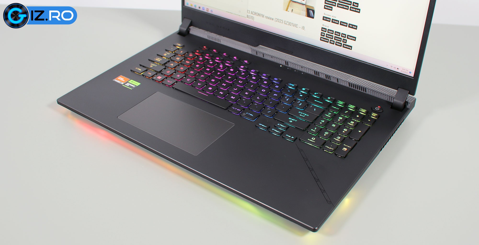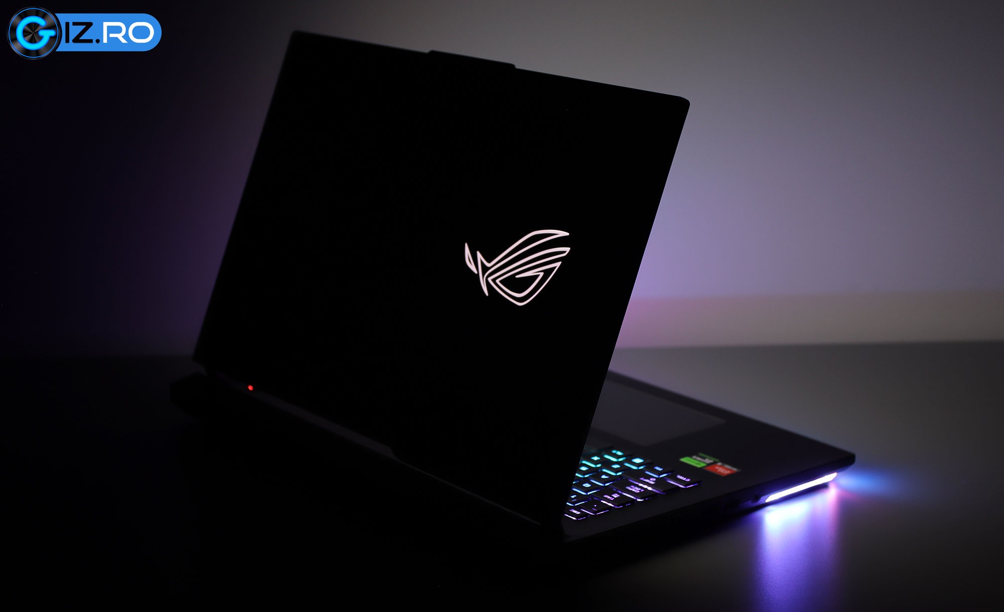 În final, sistemul de iluminare RGB este și el discutabil. Bara frontală, care acoperă și colțurile, poate fi particularizată după bunul plac și nu este o problemă. Vechea siglă ROG fără iluminare de la generația 2022 a fost însă înlocuită cu o siglă cu iluminare RGB care este mereu aprins, ceea ce va face laptopul mai greu de acceptat în mediile business sau academice.