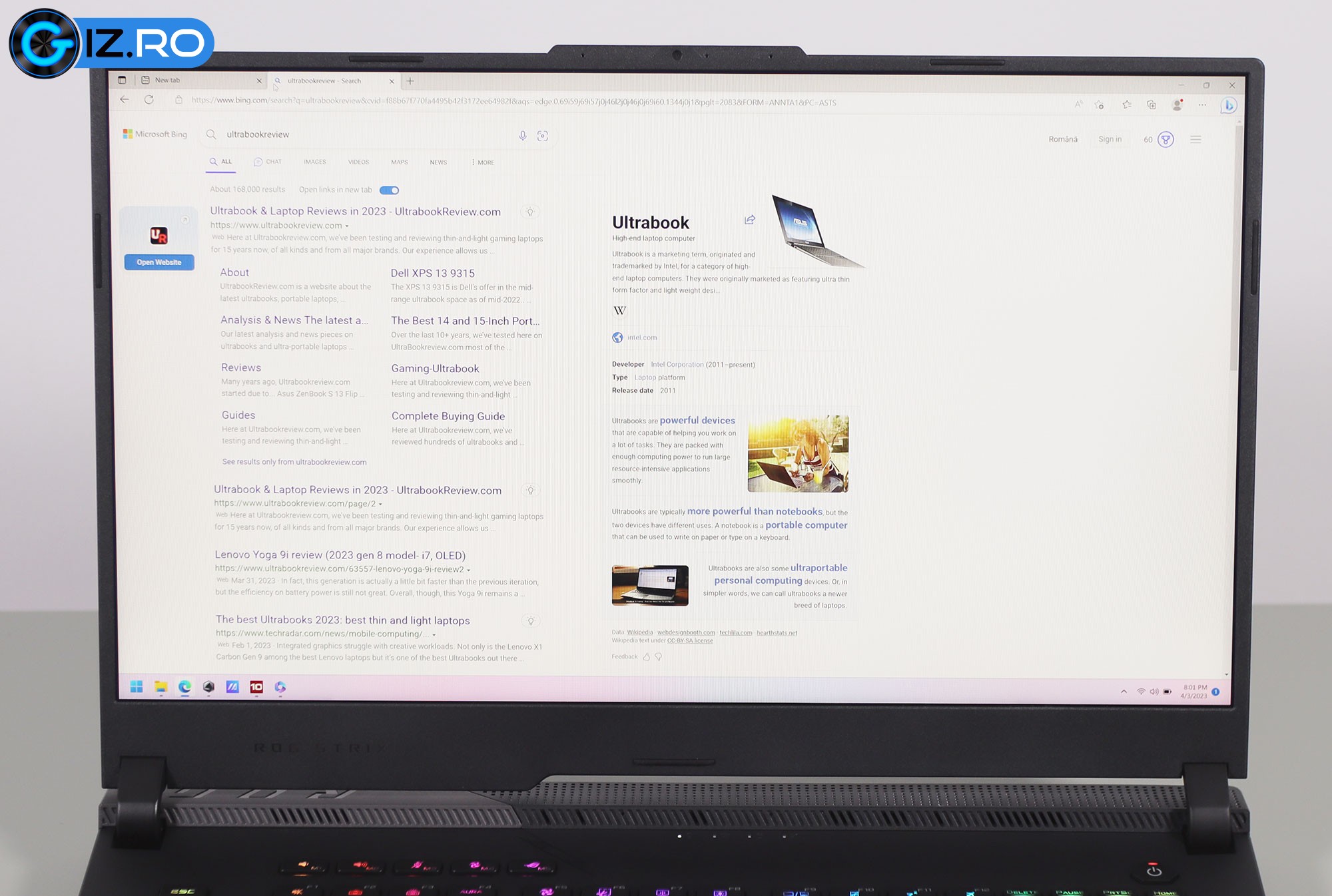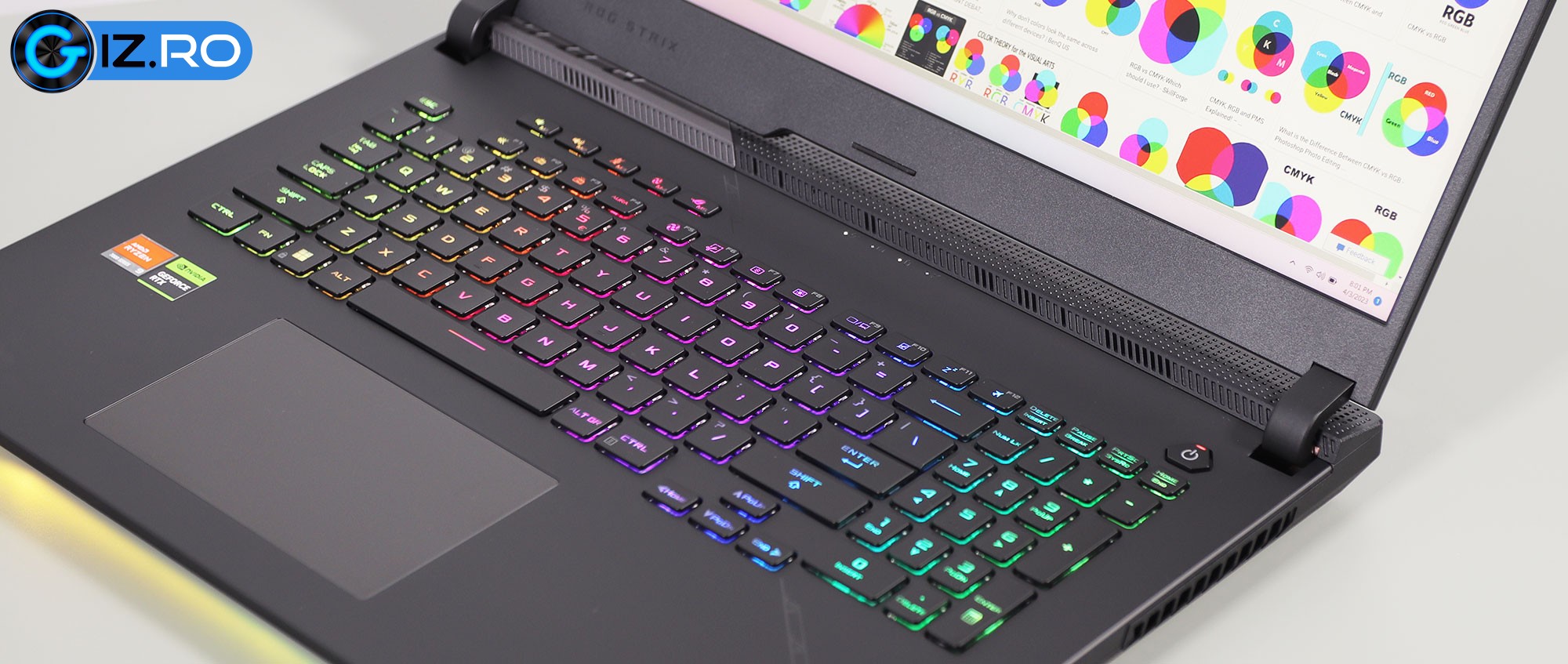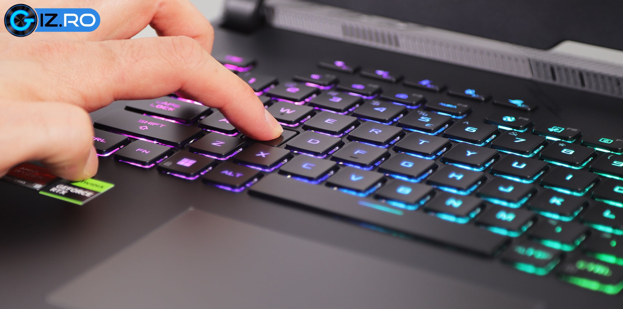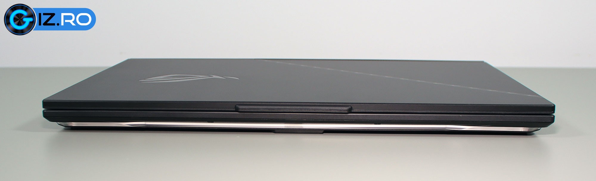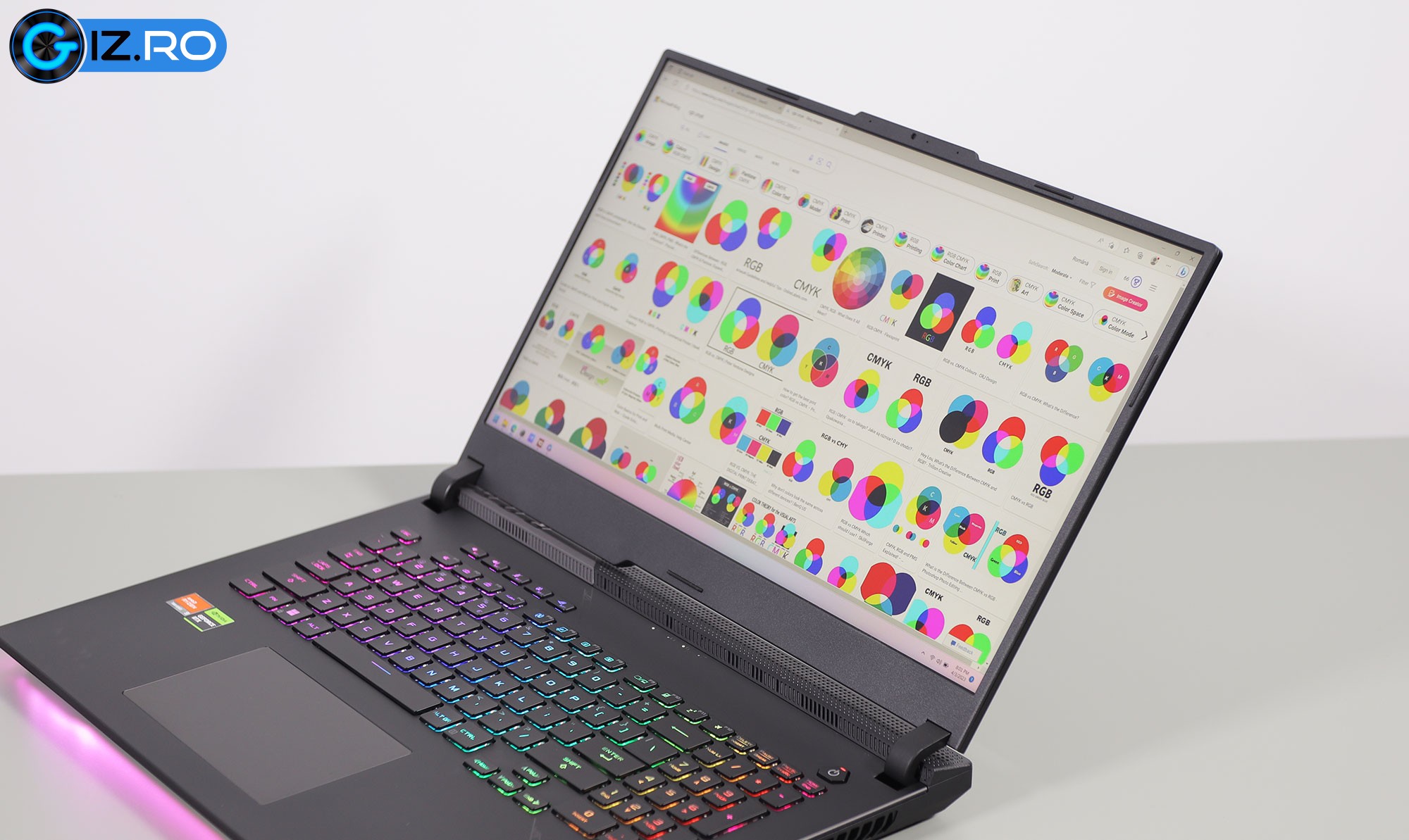 În final, sistemul de iluminare RGB este și el discutabil. Bara frontală, care acoperă și colțurile, poate fi particularizată după bunul plac și nu este o problemă. Vechea siglă ROG fără iluminare de la generația 2022 a fost însă înlocuită cu o siglă cu iluminare RGB care este mereu aprins, ceea ce va face laptopul mai greu de acceptat în mediile business sau academice.