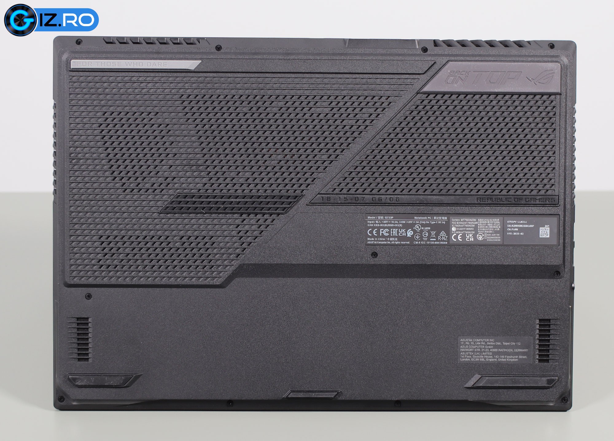 Sistemul de răcire este același din ROG Scar 17 SE și este o variantă ceva mai clasică decât cea văzută pe alte modele ROG 2023. Acest sistem este capabil să susțină configurația de față, dar ar fi putut sta un pic mai bine la capitolul răcirii procesorului, unde se remarcă o ușoară limitare de natură termică. Temperaturile în cursul rulării jocurilor sunt cam mari cu laptopul așezat pe masă, însă ridicarea lui pe un stativ elimină toate probleme indiferent de scenariu și de profilul de putere ales.