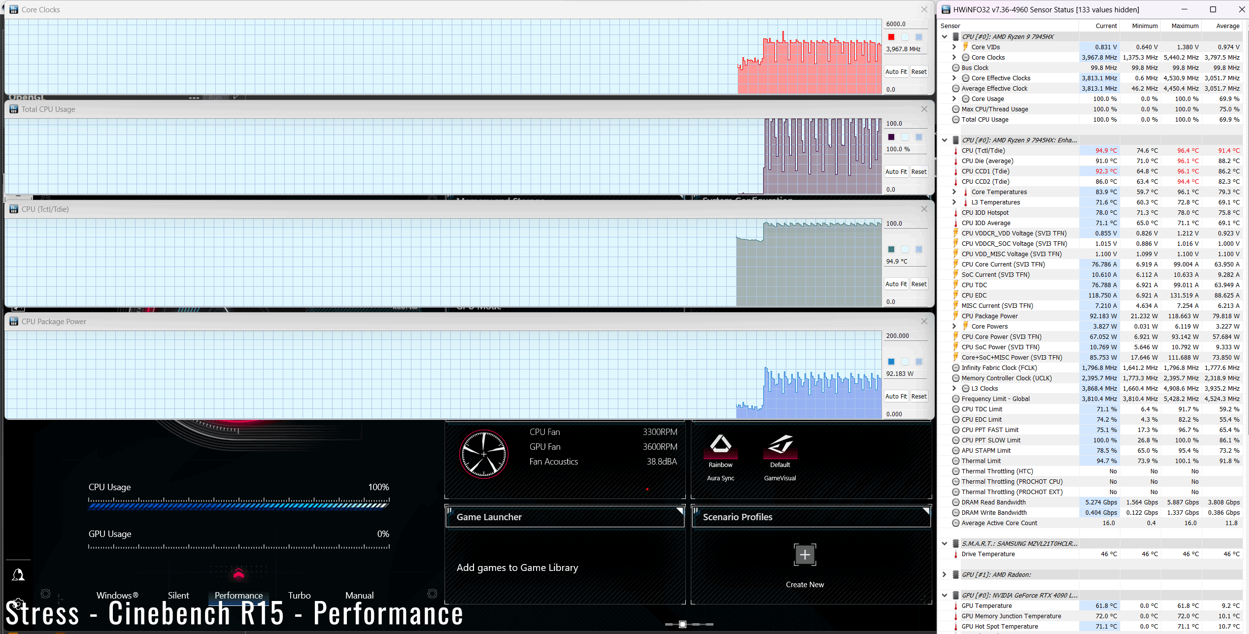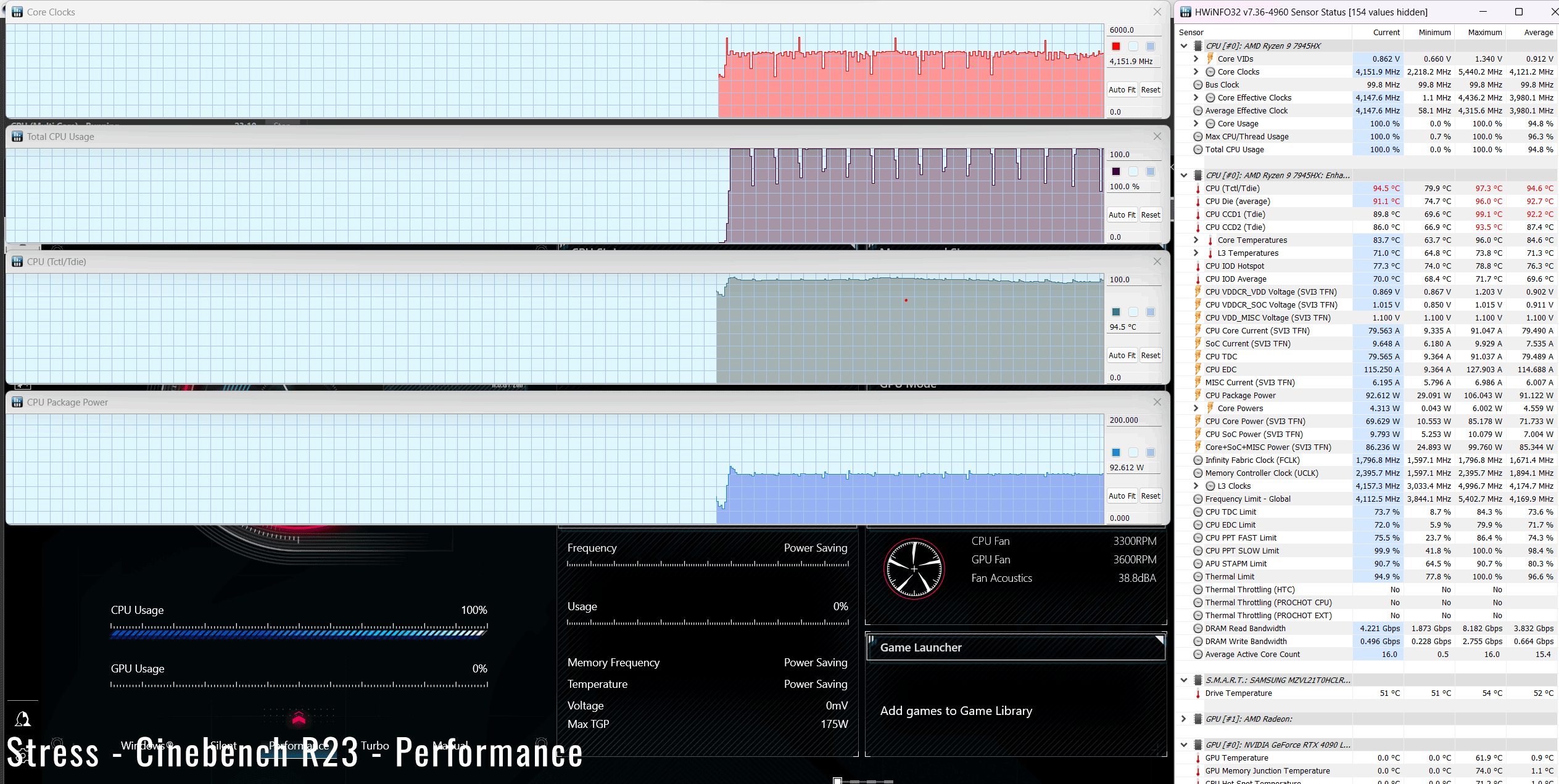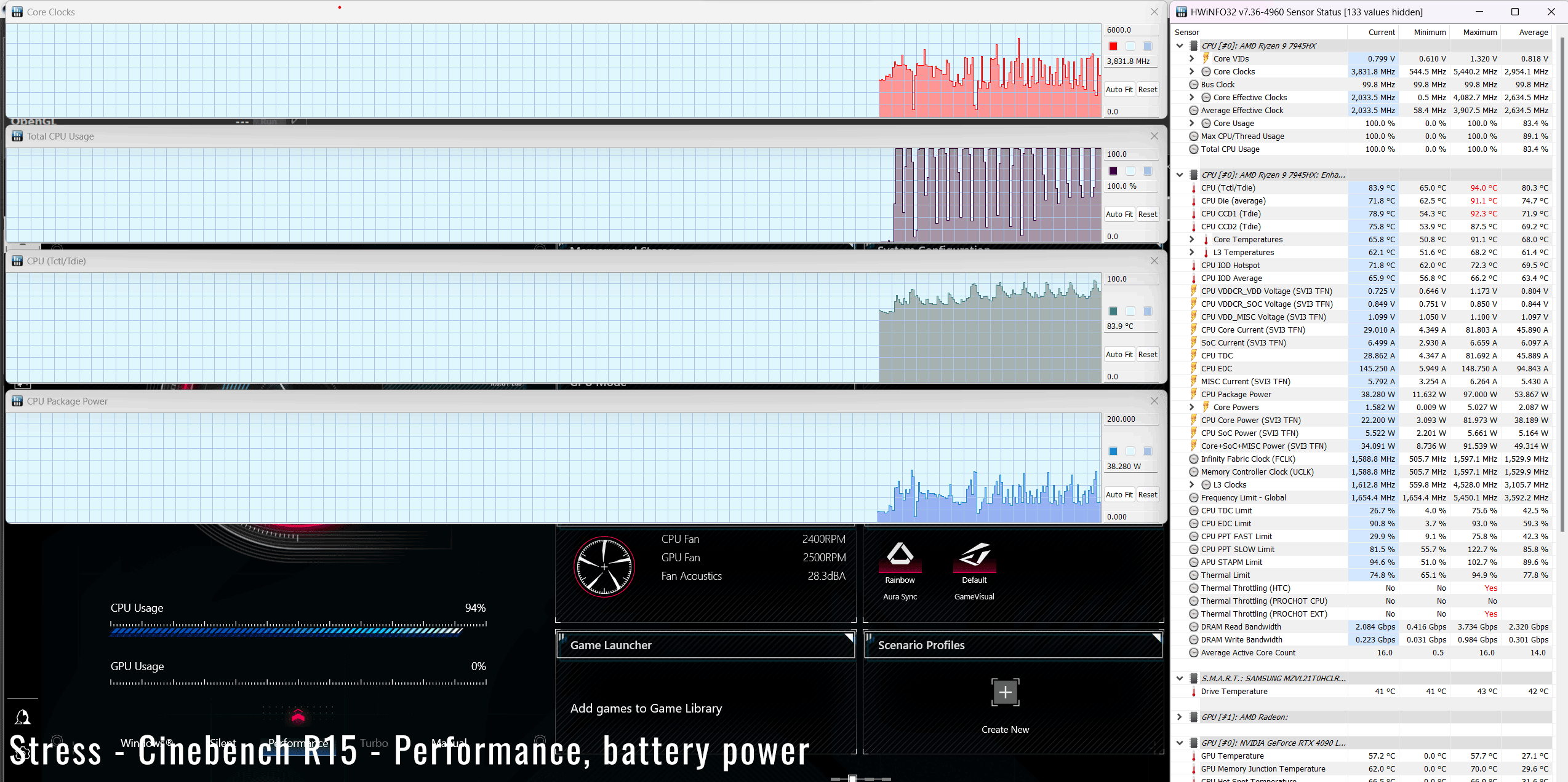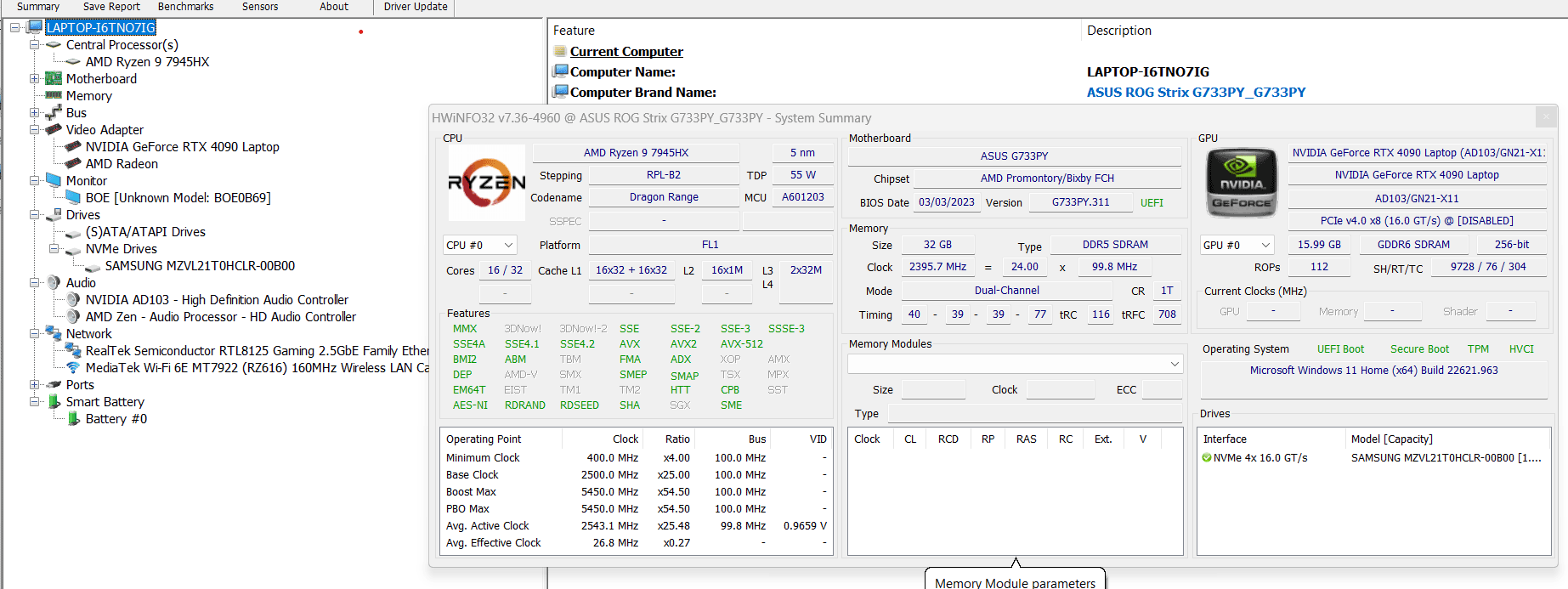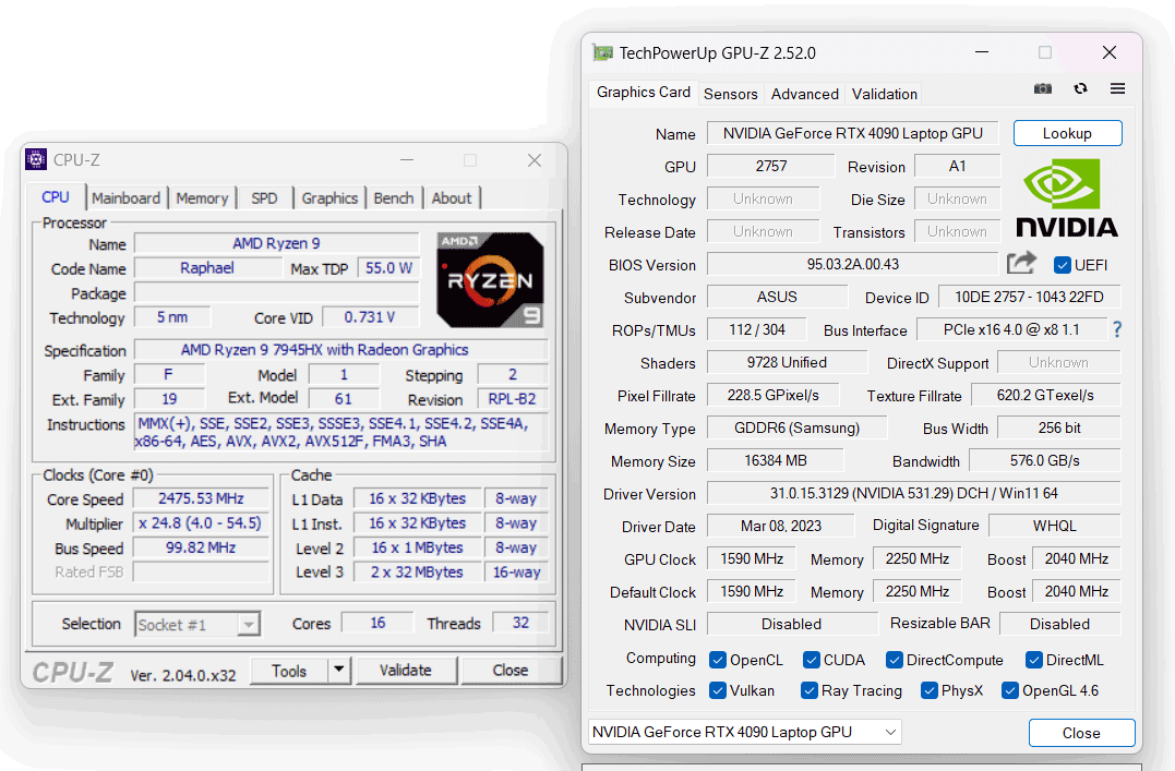 După cum se vede, laptopul este construit folosind cele mai noi platforme hardware de la AMD și NVIDIA. Procesorul Ryzen 9 7945HX este vârful de gamă al familiei de procesoare pentru laptopuri Ryzen 7000 Dragon Range, acesta folosind arhitectura Zen4 și oferind 16 nuclee și 32 de fire de execuție hardware. Dragon Range este platformă pentru laptopuri care oferă nuclee full-power, diferind deci de oferta hibridă Intel, și oferă deci maximum de putere în sarcină susținută, însă nu este la fel de eficient energetic atunci când este alimentat de la baterie ca precedentele oferte AMD.