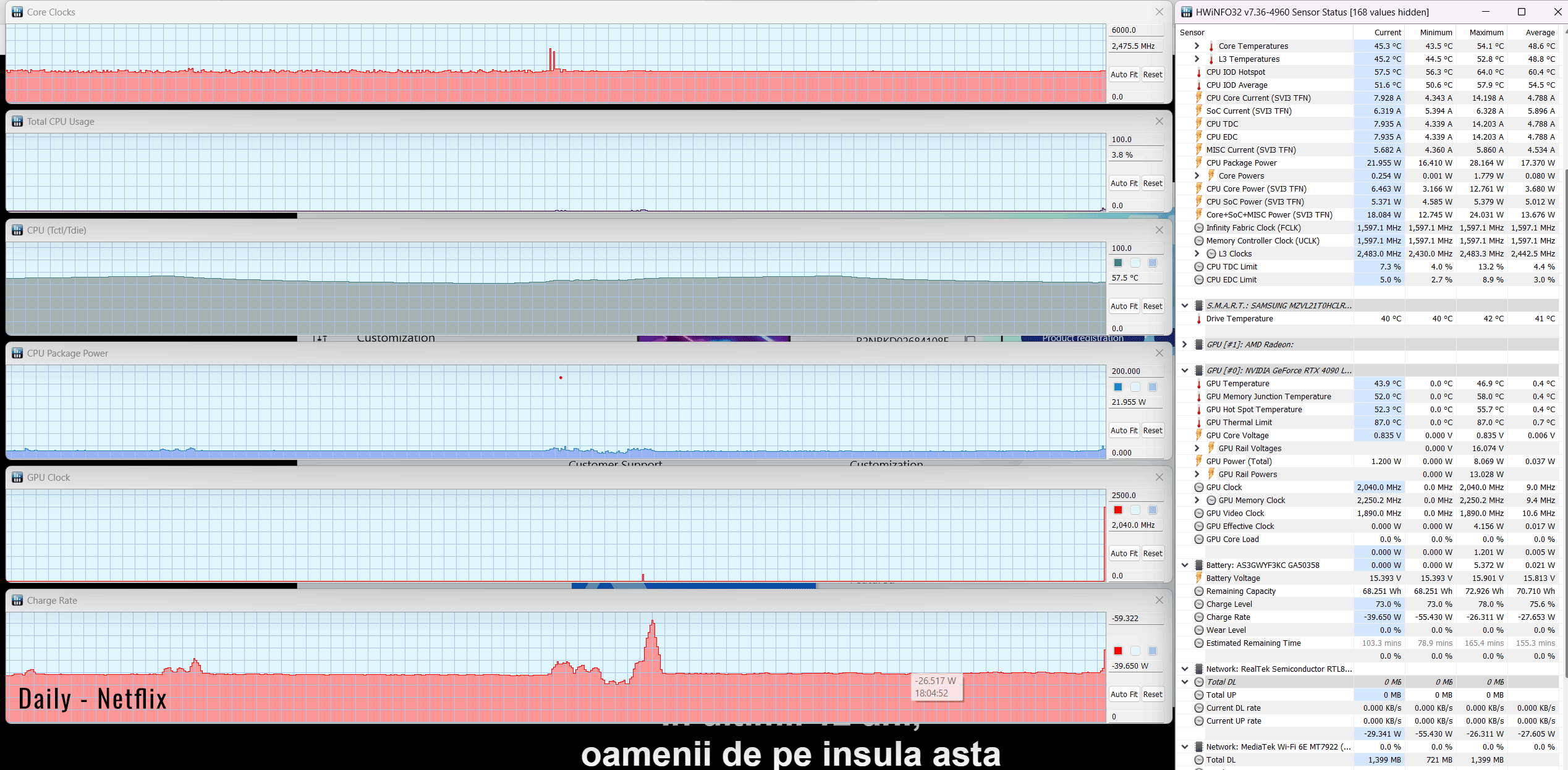 Asta, pe de o parte, pentru că este printre cele mai accesibile notebook-uri 4090, dacă putem vorbi de accesibilitate la acest nivel de preț. Dar și pentru că este o implementare puternică, cu performanțe solide și termice foarte bune, chiar dacă prizele de aer sunt puțin sufocate cu laptopul așezat pe birou și veți dori să îl așezați pe un suport înălțat sau pe cooling pad în cazul unor sarcini mai solicitante sau sesiuni de gaming prelungite. Dacă faceți acest lucru, temperaturile interne și externe nu vor reprezenta o problemă în acest design deja învechit.