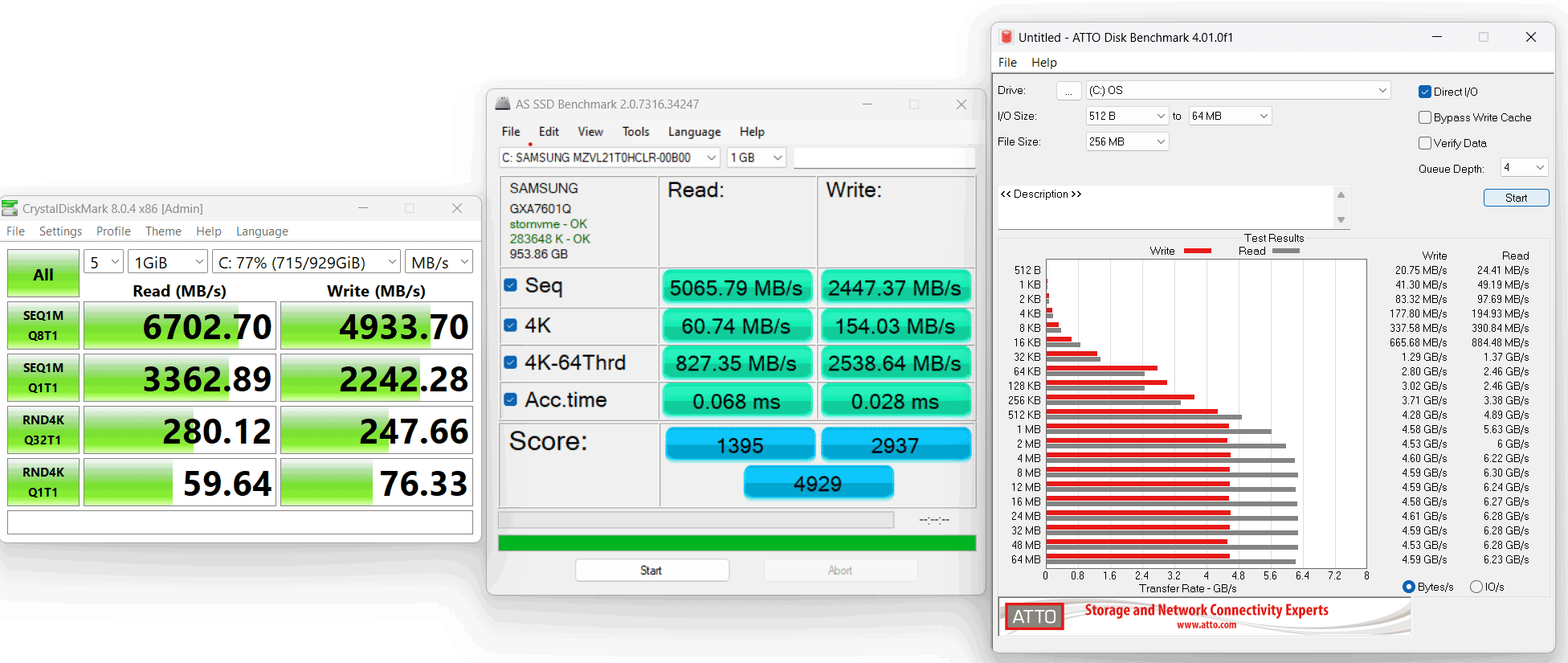 Laptopul oferă două locașuri pentru memorii DDR5 pentru un maximum de 64 GB, exemplarul de față venind echipat cu 32 GB. Pentru unitățile de stocare sunt oferite două locașuri M.2 2280, unul dintre ele fiind ocupat de un SSD rapid de la Samsung, un model PM9A1 cu capacitate de 2 TB.