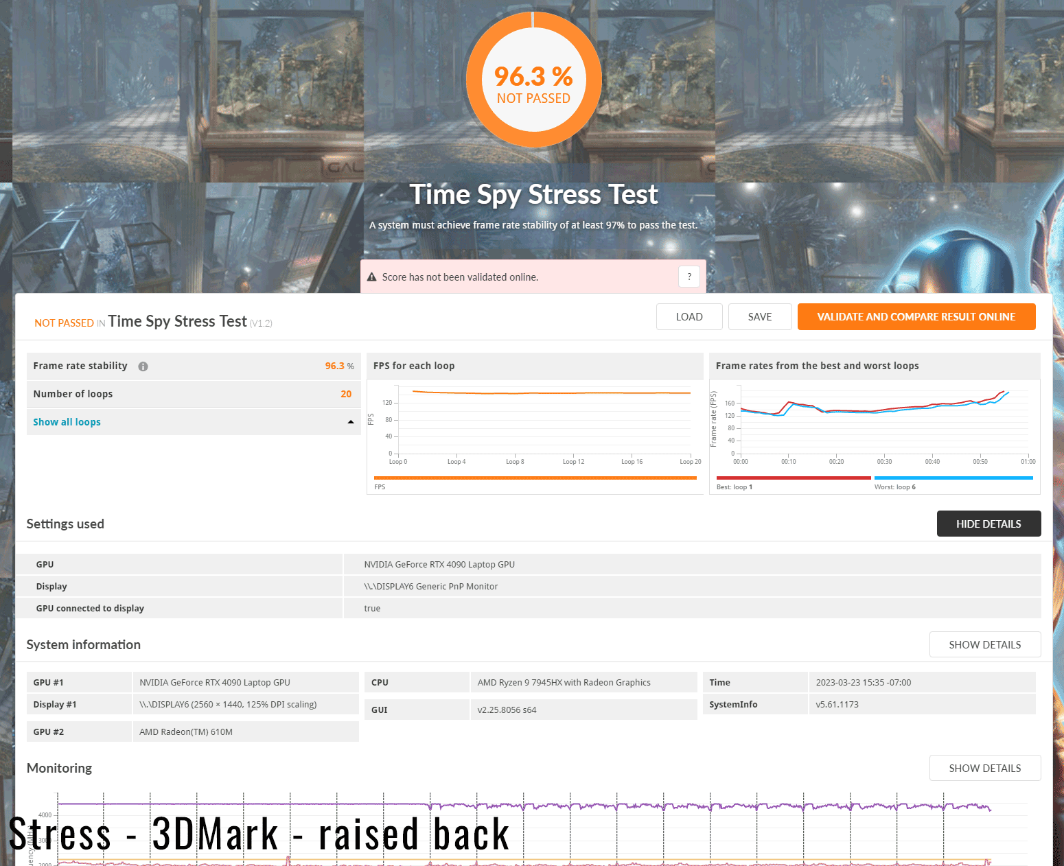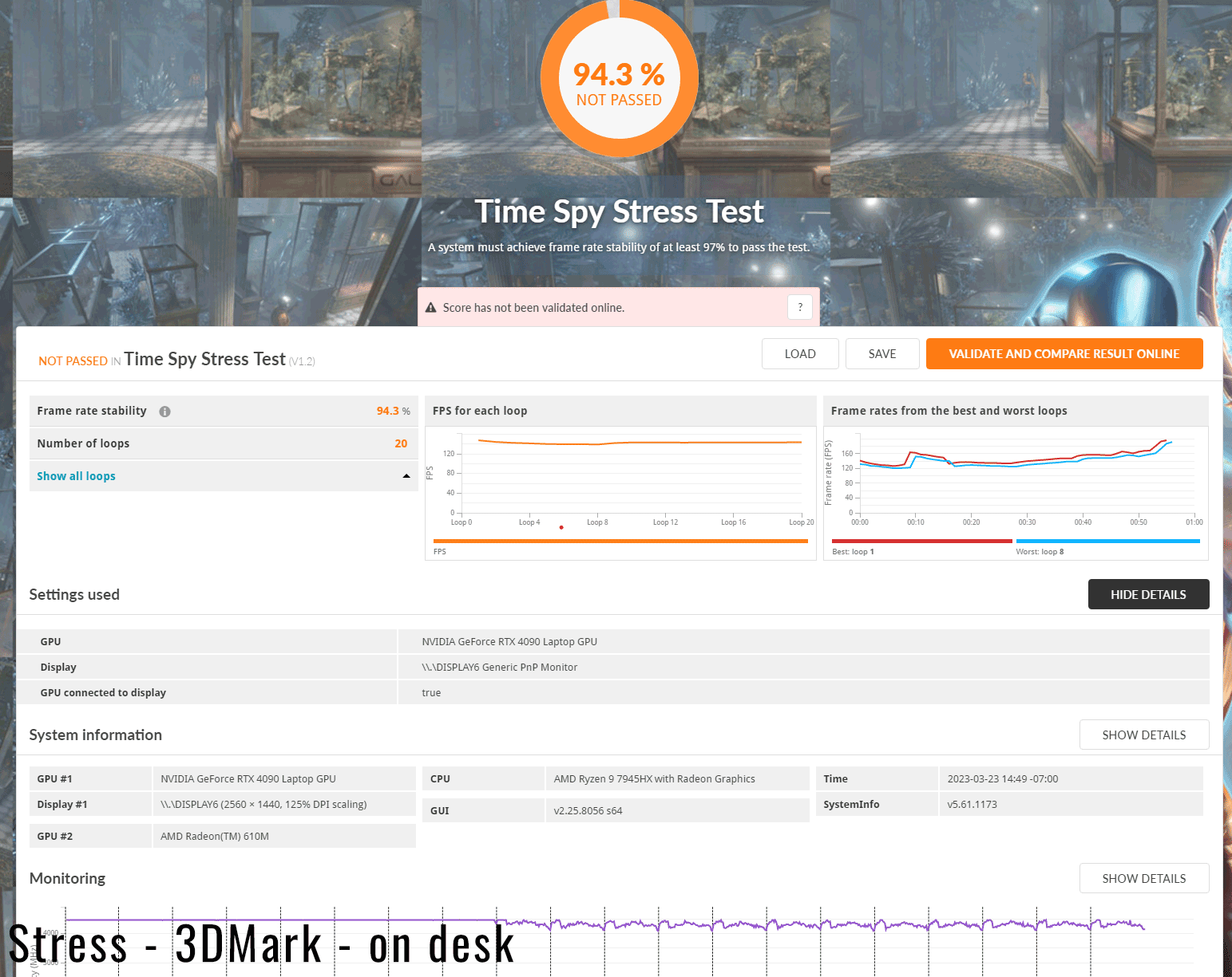 Pentru testele combinate de CPU și GPU am apelat la testul de stres din 3DMark. Laptopul a ratat la mustața acest test atunci când a fost așezat pe masă, semn că și căldura care se acumulează în interior este prea mare, dar a trecut testul când a fost ridicat de pe masă.