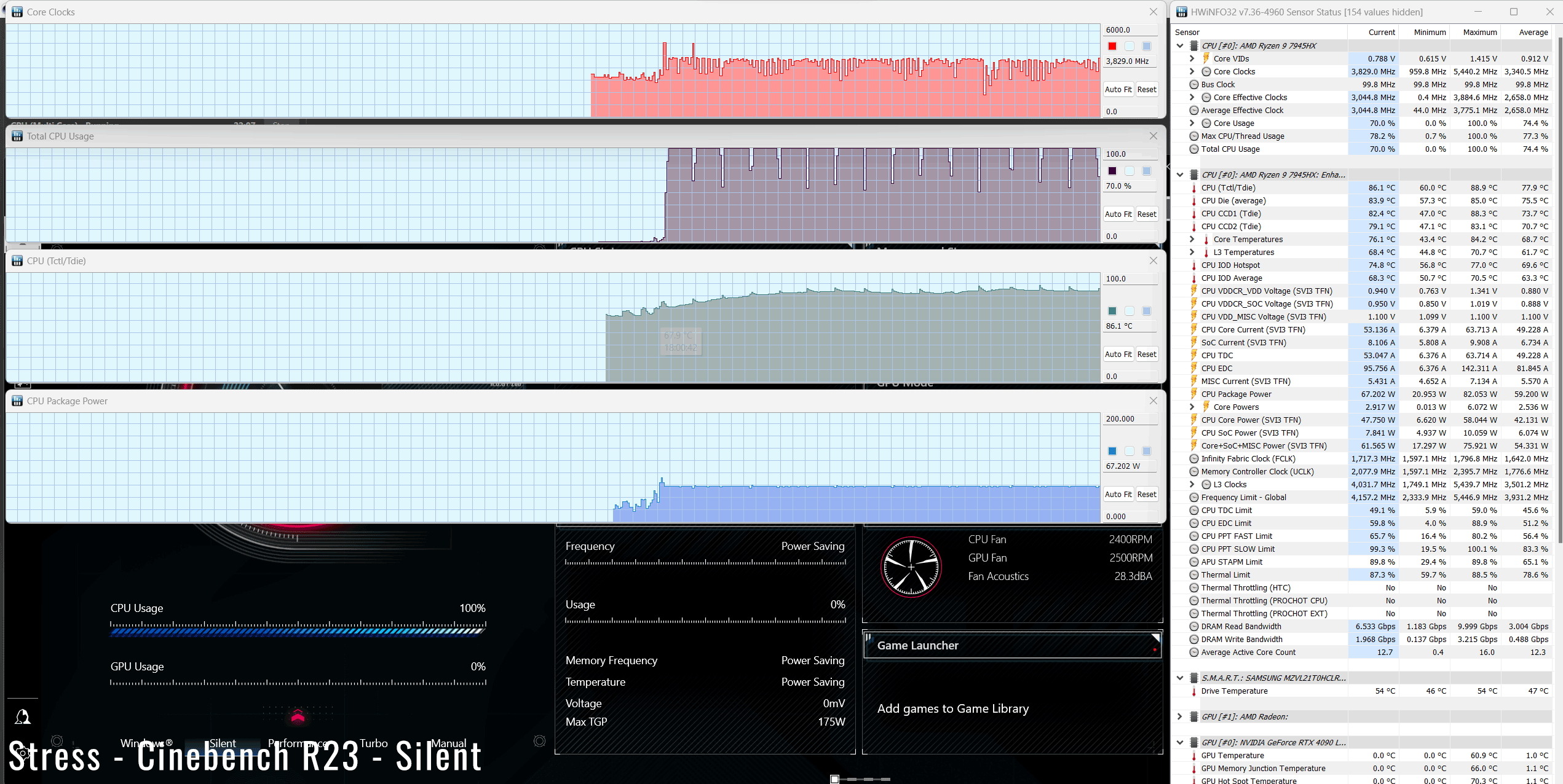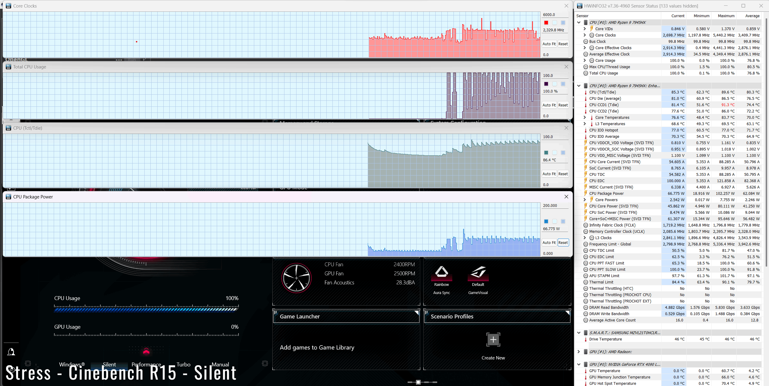 Cu profilul Silent activat, procesorul Ryzen 9 se stabilizează la un consum de circa 65W, temperaturi de circa 85 de grade și un nivel de zgomot redus al sistemului de răcire de circa 35 dB. Scorul obținut acum este de 4500 de puncte, cam 80% din performanța atinsă cu profilul Turbo.