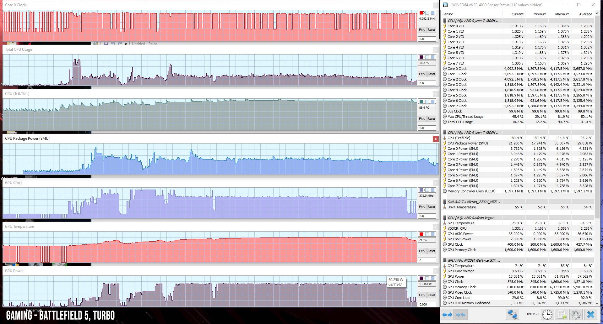 Procesorul Ryzen 7 4800HS s-a stabilizat la frecvențe de peste 3400 MHz, temperaturi de 78 – 82 de grade și a obținut un scor CineBench de 1620 de puncte. TDP-ul inițial a fost de 42W, dar a scăzut după 7-10 cicluri de test la 35W, cu o mică scădere de performanțe.