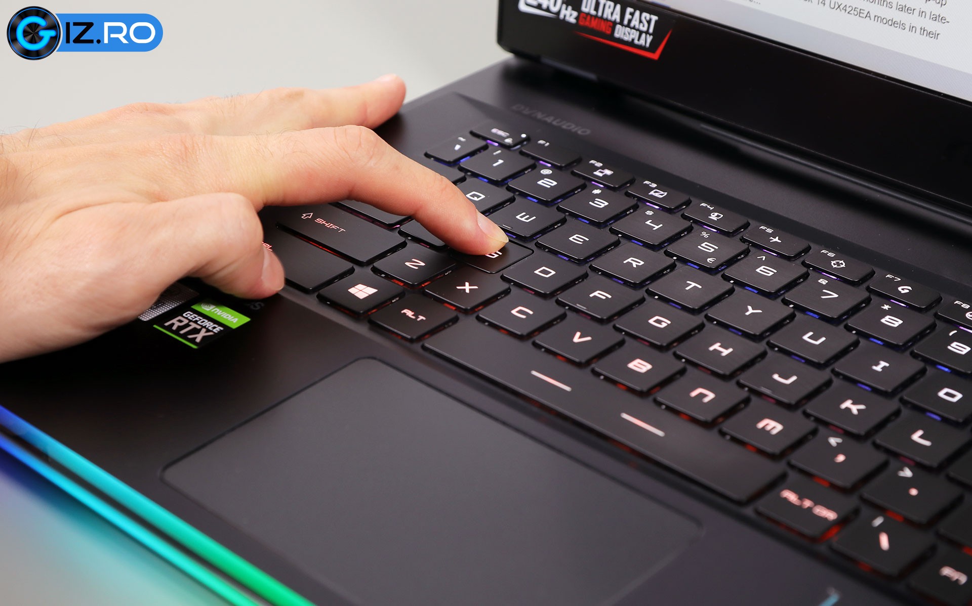Iar dacă am vorbit de finisajele bune, trebuie să menționez îmbinarea bune dintre această bară de plastic și metalul din jur, un progres de la buza frontală de pe GS66. Am apreciat și garnitura care încadrează ecranul, aceasta protejând această componentă mai fragilă atunci când umblați cu laptop în rucsac sau alte bagaje.