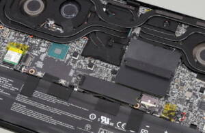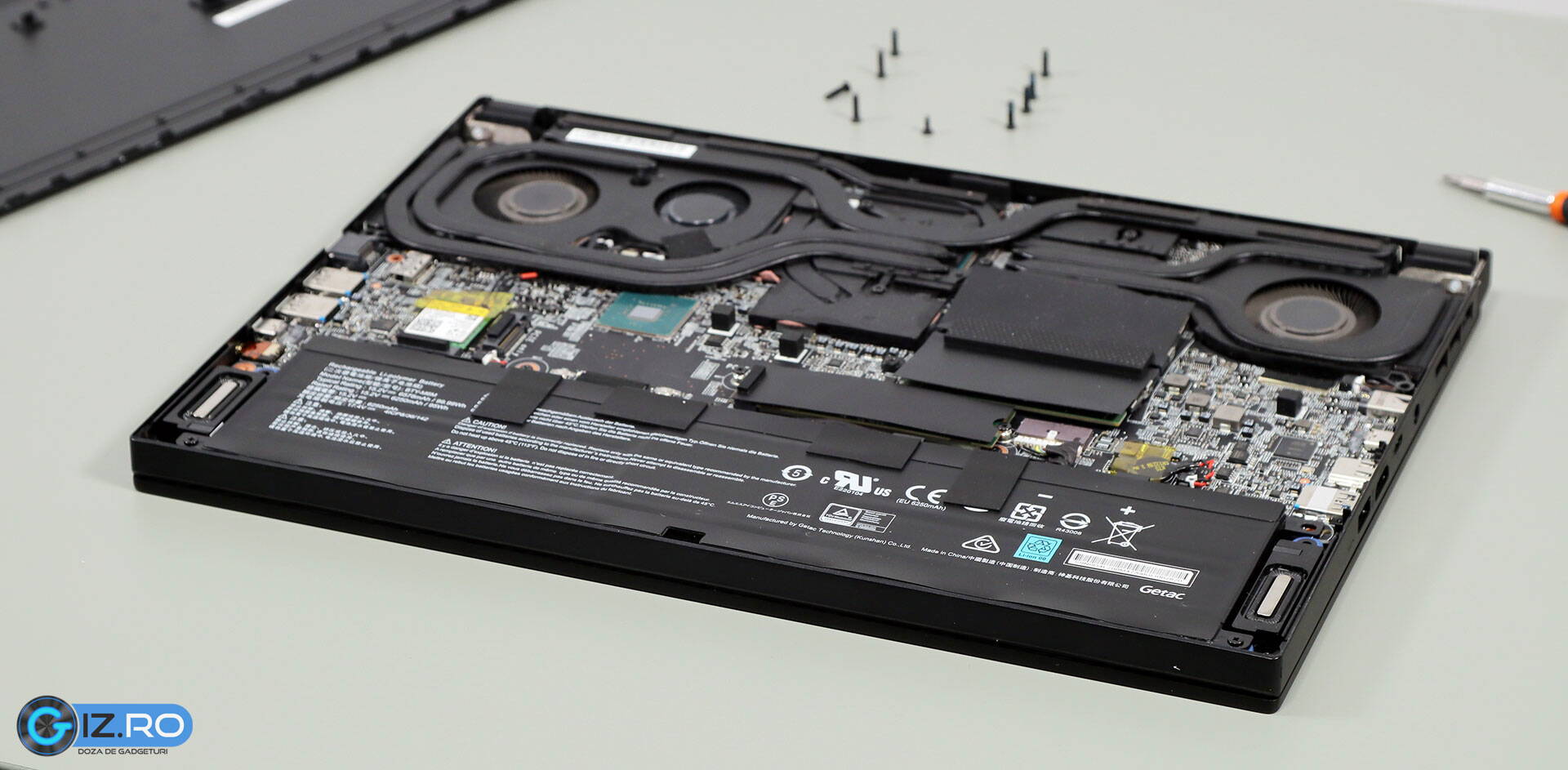 Accesul la componentele interne este simplu, necesitând doar înlăturarea unor șuruburi și a capacului inferior. Utilizatorul are astfel acces la cele două sloturi de memorie, la cele două locașuri M.2 pentru SSD, al interfața wireless și la baterie. Atenția însă la sigilii, exemplarul nostru a avut un șurub acoperit de un astfel de sigiliu, fapt ce duce la pierderea garanției în cazul în care deschideți voi laptopul și nu vă adesați unui service recomandat de MSI, un aspect care v-ar putea face să vă îndreptați spre un alt produs, și pe bună dreptate.
