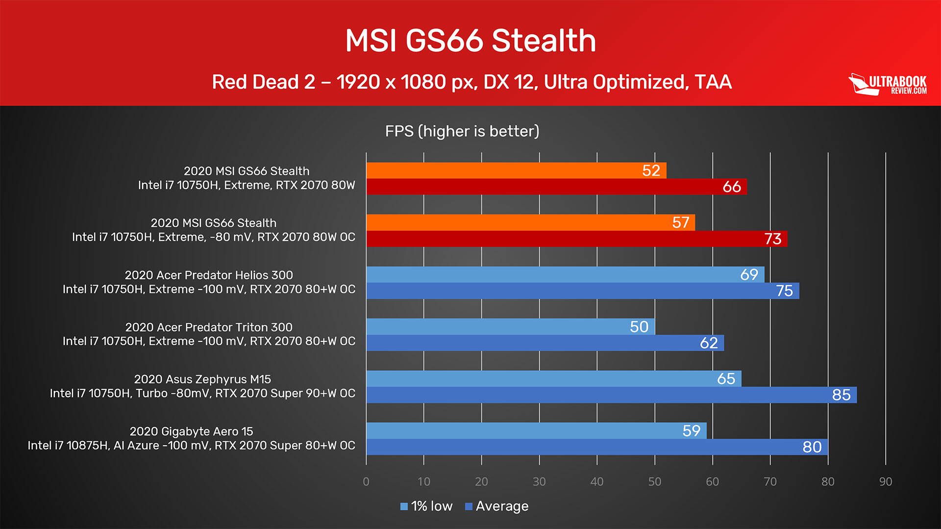 Red Dead Redemption 2 (DX 12, Ultra Optimized, TAA) | 66 fps (52 fps – 1% low) | 73 fps (57 fps – 1% low) | 62 fps (47 fps – 1% low) | 48 fps (39 fps – 1% low) |