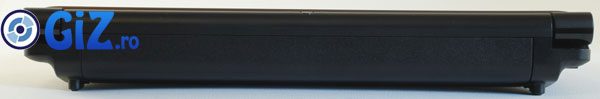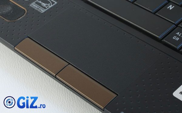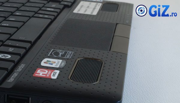 Să trecem la trackpad: acesta nu este separat în niciun fel de palm rest, însă îţi vei da seama de “graniţele” sale datorită texturii diferite dintre cele două secţiuni. Din păcate, caracterul aspru al materialului din care este confecţionat mi-a creat uneori probleme: fie nu a răspuns corect la comenzi, fie pur şi simplu nu a răspuns deloc. Un alt punct negativ este lăţimea mică a acestuia, care nu compensează lungimea apreciabilă. În schimb, am fost mulţumit de prezenţa a două taste pentru click stânga şi, respectiv, click dreapta, chiar dacă sunt poziţionate în marginea inferioară a netbook-ului.